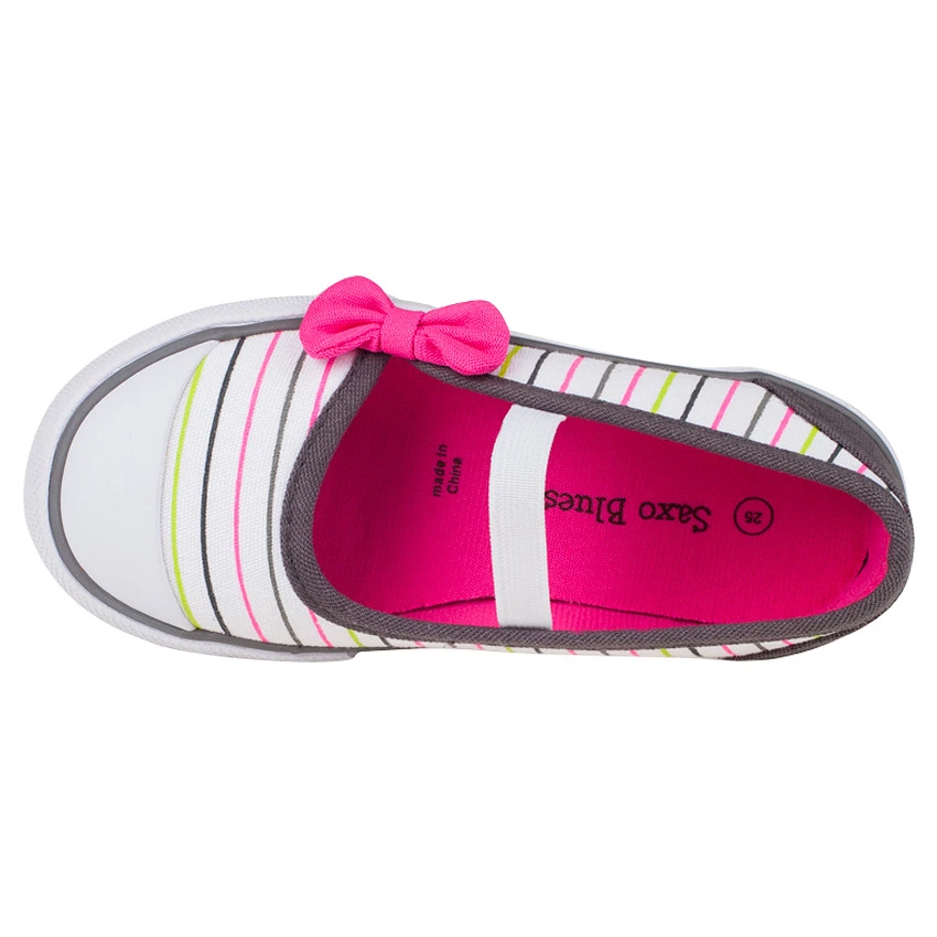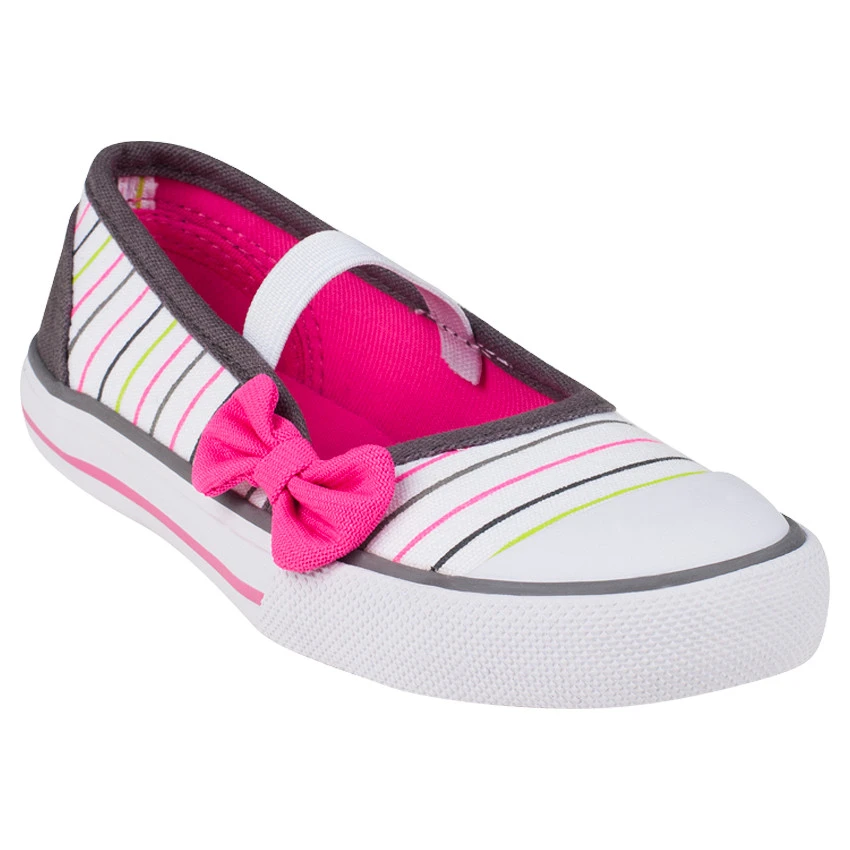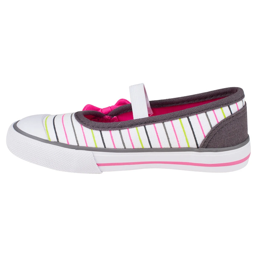 Babies en toile. Coloris blanc. Imprimé rayures multicolores « all-over ». Doublure fushia. Bords et empiècement à l’arrière de la cheville contrastés. Elastique sur le dessus du pied. Noeud fantaisie contrasté cousu sur le côté. Contrefort à l’arrière du pied. Bout et semelle extérieure en caoutchouc.