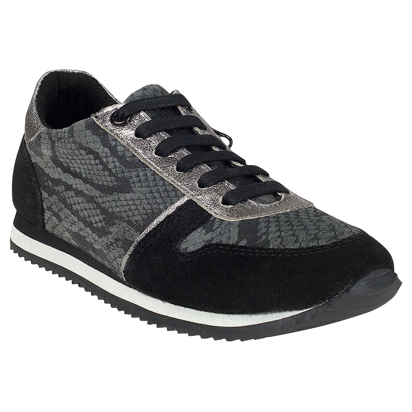 Baskets basses en cuir suédé. Coloris noir. Ouverture à lacets dessus. Empiècement doré cousu dessus. Bourrelet de renfort à l’arrière de la cheville. Jeu d’empiècement gris, effet serpent. Ouverture zippée sur le côté. Semelle extérieure crantée, contrastée, en caoutchouc souple.