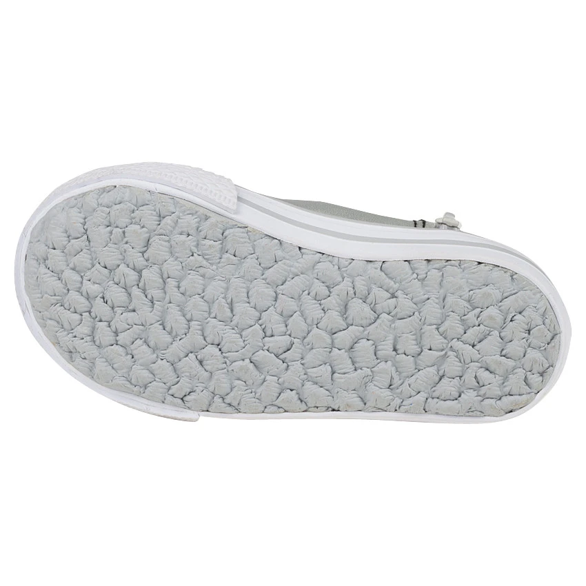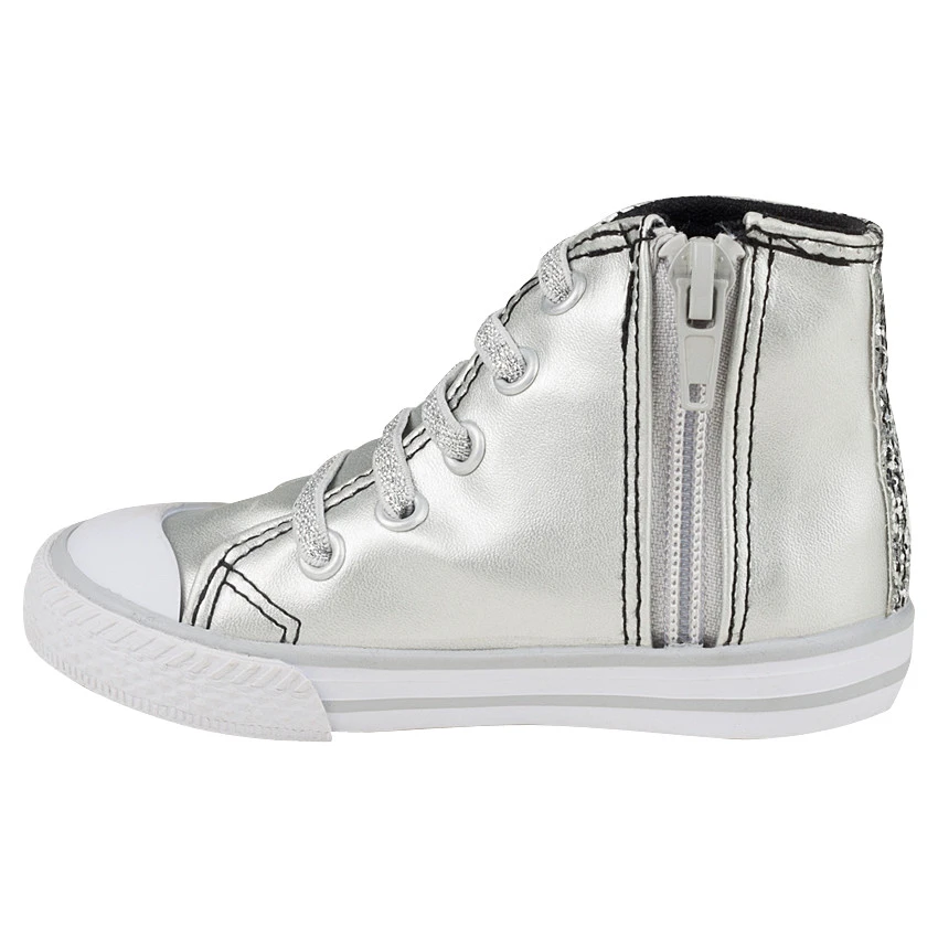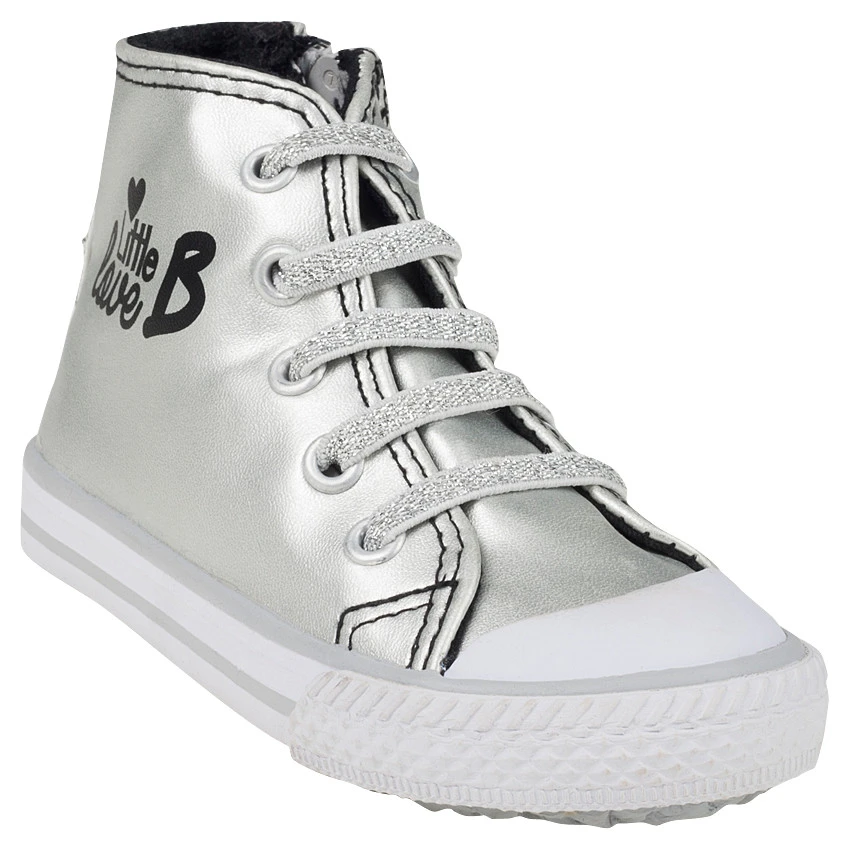 Baskets montantes. Couleur argent. Ouverture à lacet pailleté. Ouverture zippée sur le côté. Inscription « Little love B » printée sur le côté. Bande à paillettes cousue à l’arrière de la chaussure. Jeu de surpiqûres. Bout et semelle extérieure en caoutchouc antidérapant.