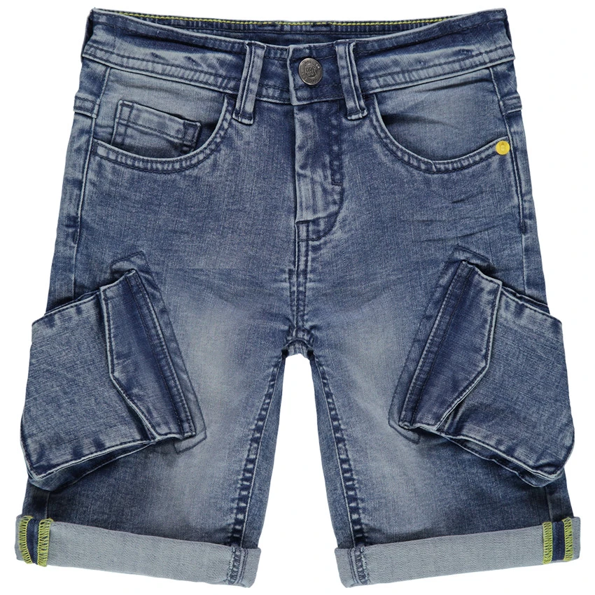 Bermuda en jean effet used. Esprit cargo. Taille ajustable de l’intérieur par élastique et boutons. Ceinture à passants avec bouton et braguette zippée. 2 poches cavalières. 1 poche ticket. 2 poches soufflet sur les côtés. 2 poches à rabats pressionnés au dos.