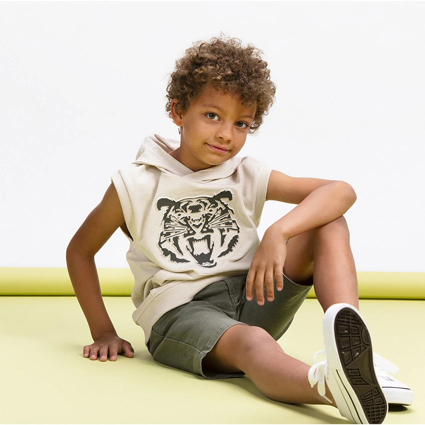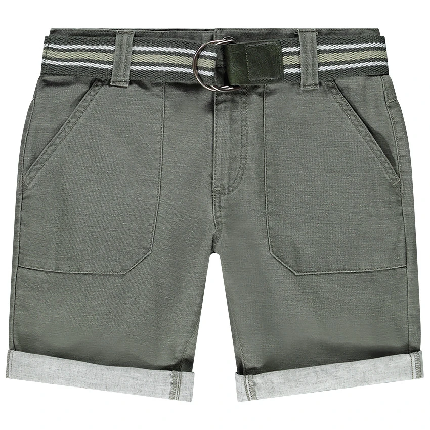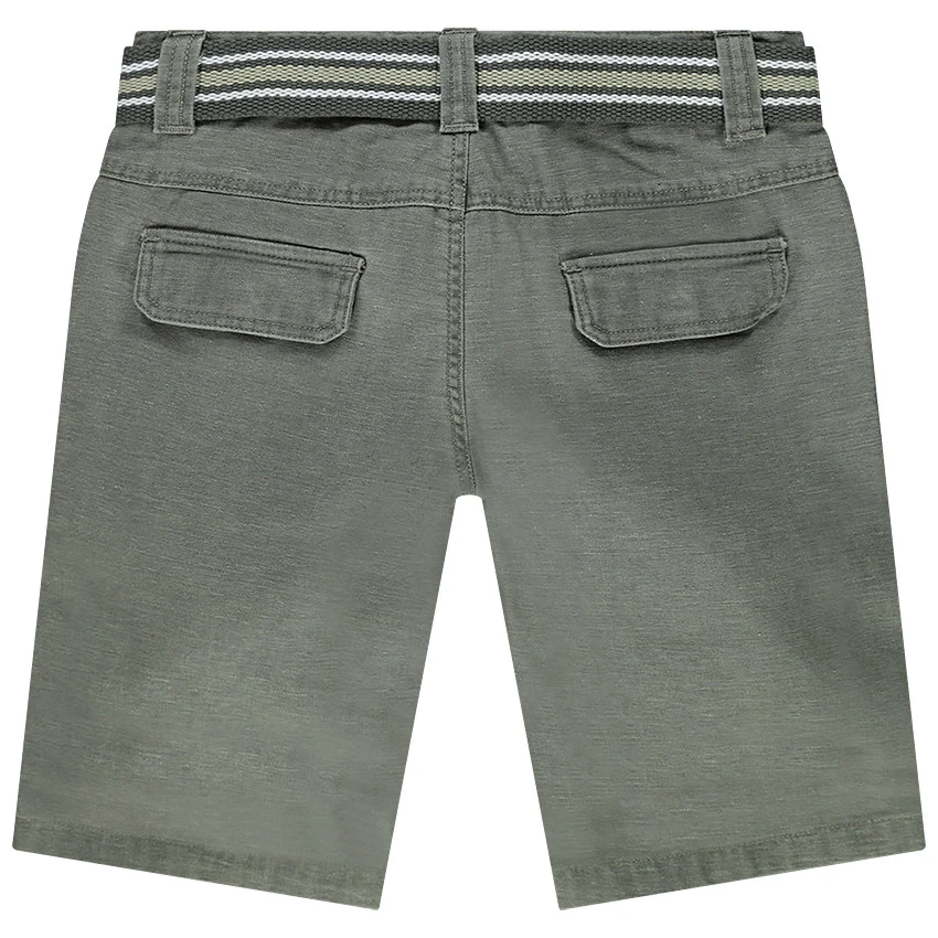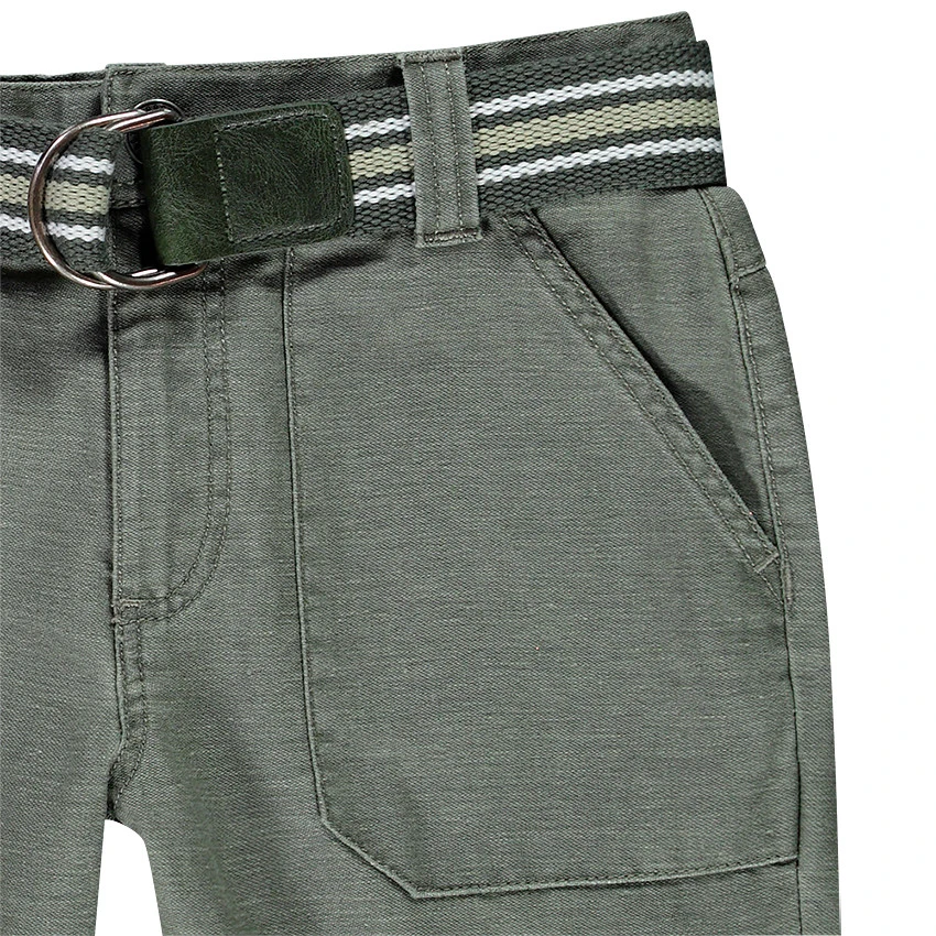 Bermuda cargo. Passants pour ceinture. Ceinture avec bandes contrastées. Ouverture boutonnée sur le devant. Deux poches italiennes plaquées sur le devant. Revers sur le bas du bermuda. Deux poches à rabat à l’arrière.
