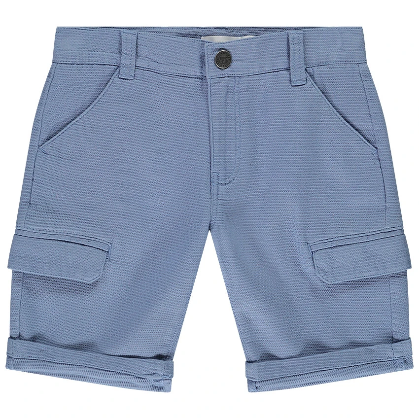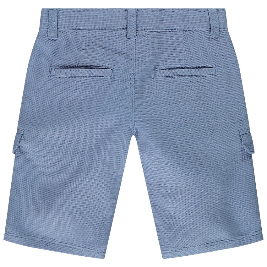 Bermuda court bleu. Effet nid d’abeille pigmentaire. Forme chino. Passants pour ceinture. 2 poches italiennes sur le devant. 2 poches rabats sur les côtés. 2 poches passepoilées à l’arrière.