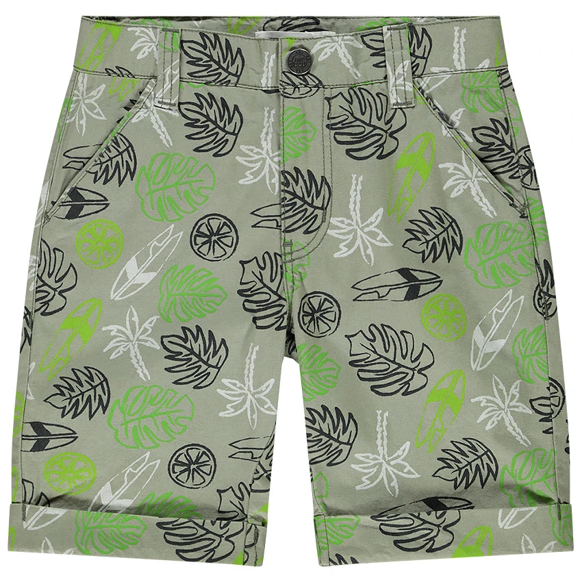 Bermuda court vert. Imprimé feuilles, palmiers, planches de surf, fruits. Passants pour ceinture. 2 poches italiennes sur le devant. 1 poche à rabat à l’arrière. Revers fixes.
