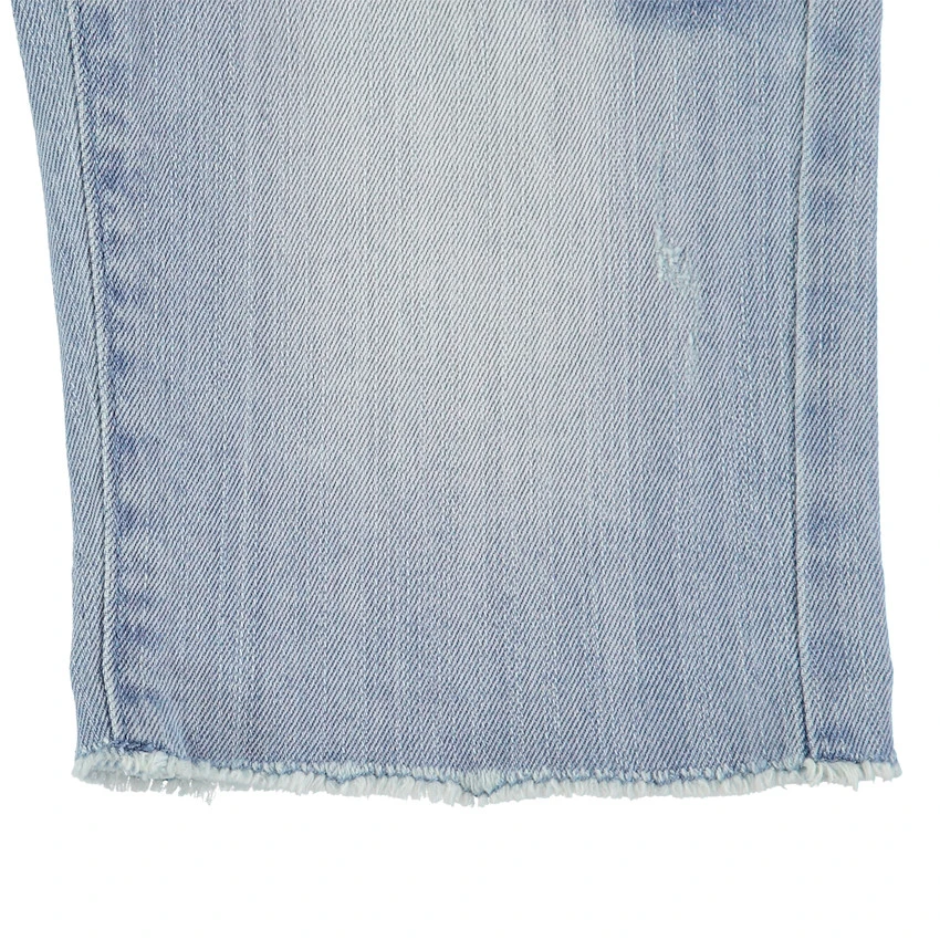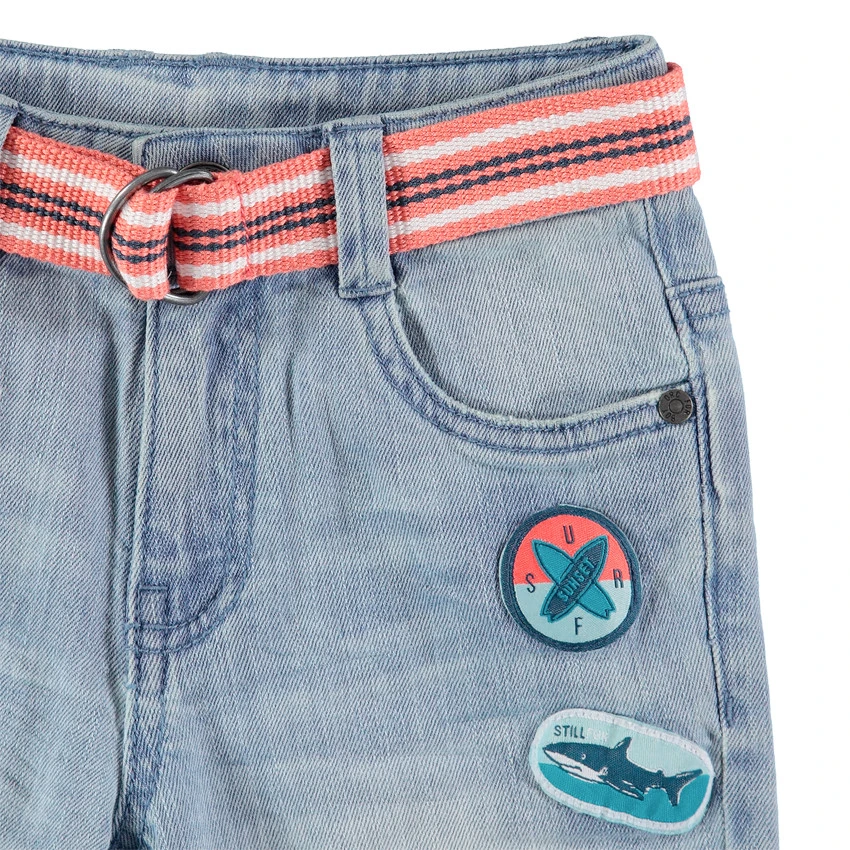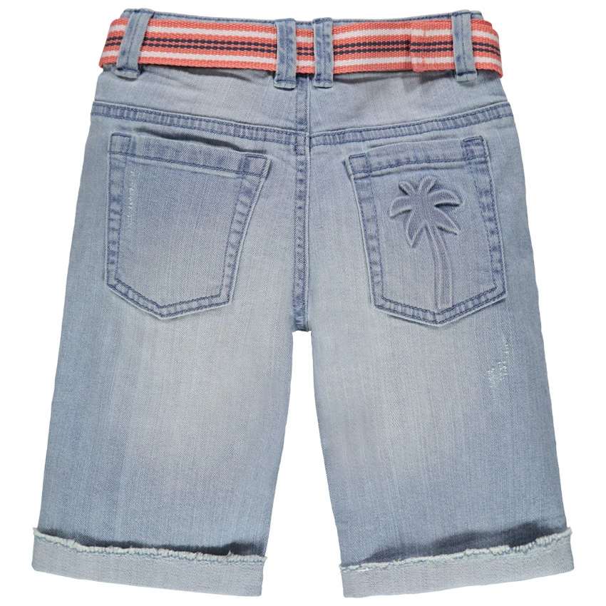 Bermuda en jean effet used. Taille ajustable de l’intérieur par élastique et boutons. Ceinture à passants avec bouton et braguette zippée. 2 poches cavalières. 1 poche ticket. Ceinture ajustable rayée. Badges patchés devant. 2 poches plaquées au dos avec palmier en relief.
