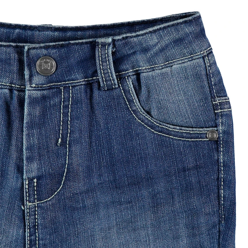 Bermuda en jean effet délavé. Taille ajustable de l’intérieur par élastique et boutons. Ceinture à passants avec bouton et braguette zippée. Deux poches cavalières et une poche ticket sur le devant. Deux poches plaquées à l’arrière. Surpiqûres contrastées all-over.
