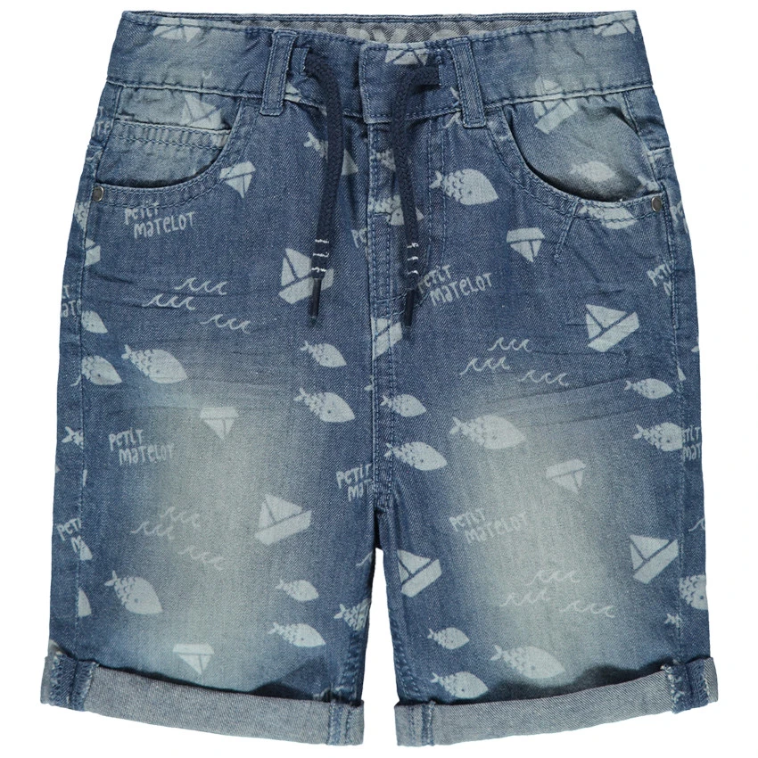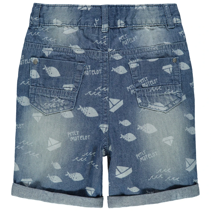 Bermuda en jean used. Motifs sur le thème de la mer en all-over. Taille ajustable de l’intérieur par élastique et boutons. Ceinture à passants avec bouton et braguette zippée. 2 poches cavalières. Cordons de serrage. 2 poches plaquées au dos.