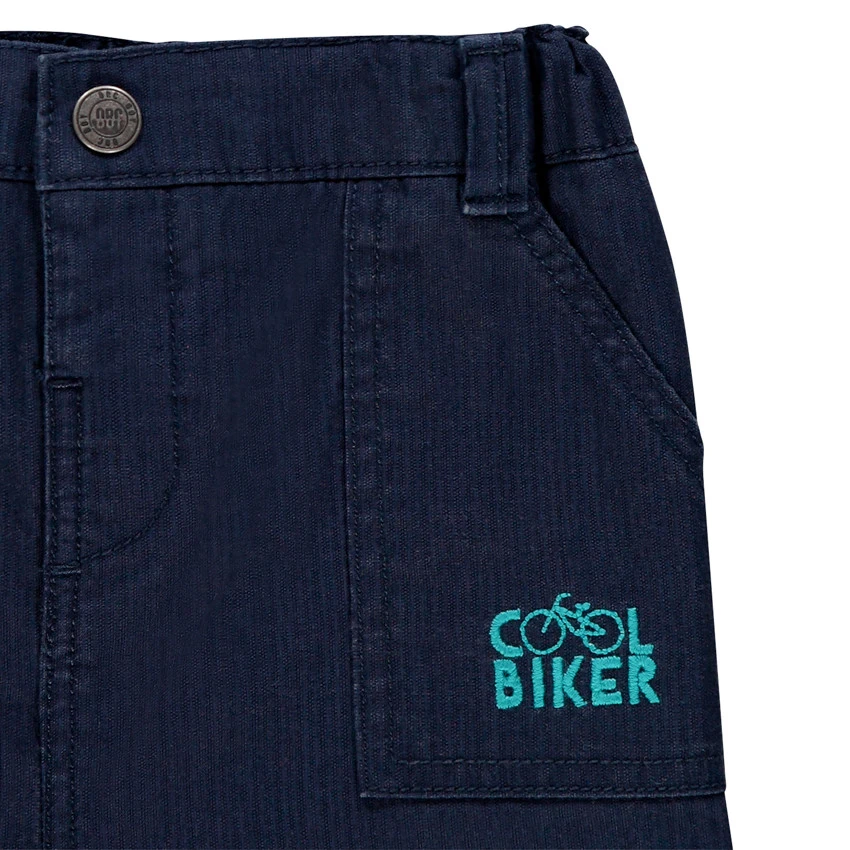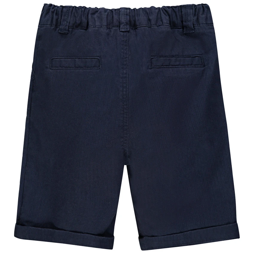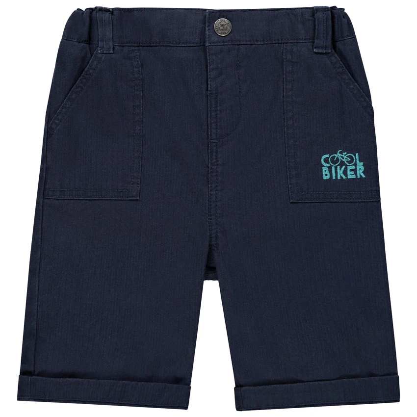 Bermuda en toile. Taille à passants élastiquée. 2 poches italiennes devant. Broderie contrastée sur la poche gauche. 2 poches coupées au dos.