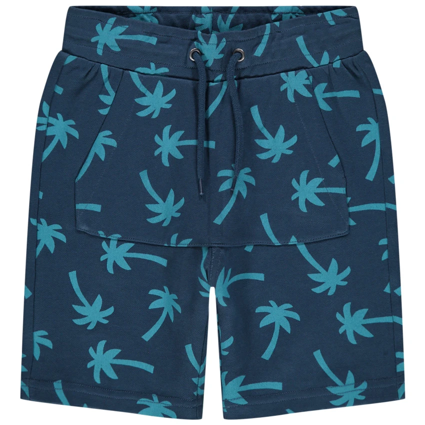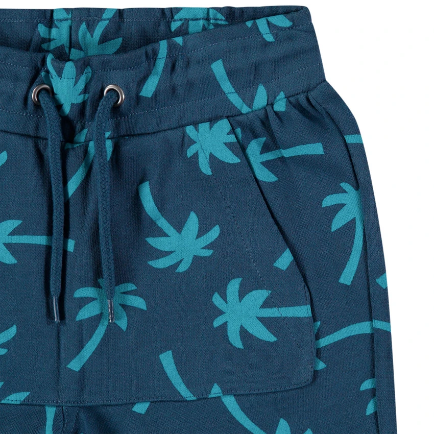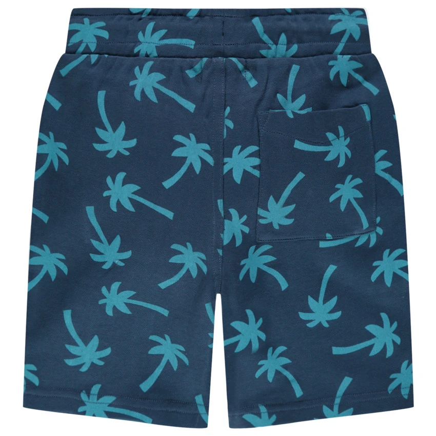 Bermuda en coton imprimé palmiers all-over. Taille élastiquée à cordons de serrage. 1 poche kangourou devant. 1 poche plaquée au dos.
