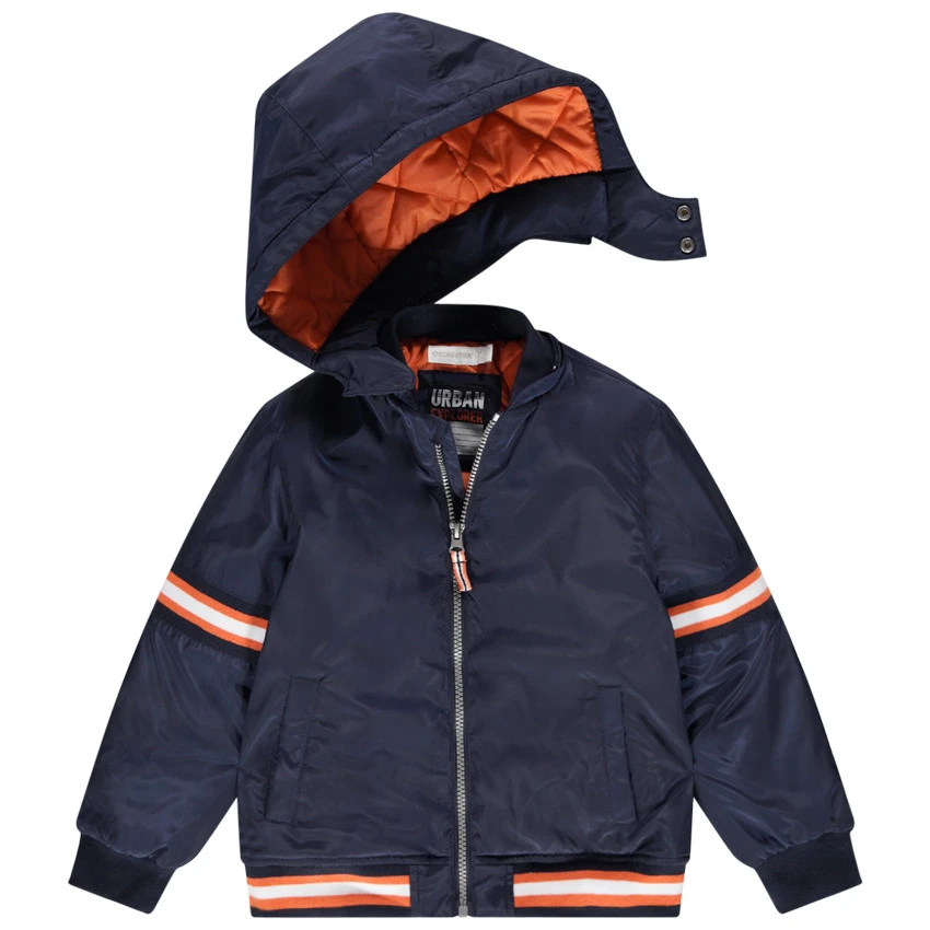 Blouson esprit bomber. Doublure contrastée. Capuche amovible par zip. Ouverture zippée devant. Bandes contrastées sur les manches. 2 poches coupées devant. Poignets élastiqués. Base en bord-côte rayé.