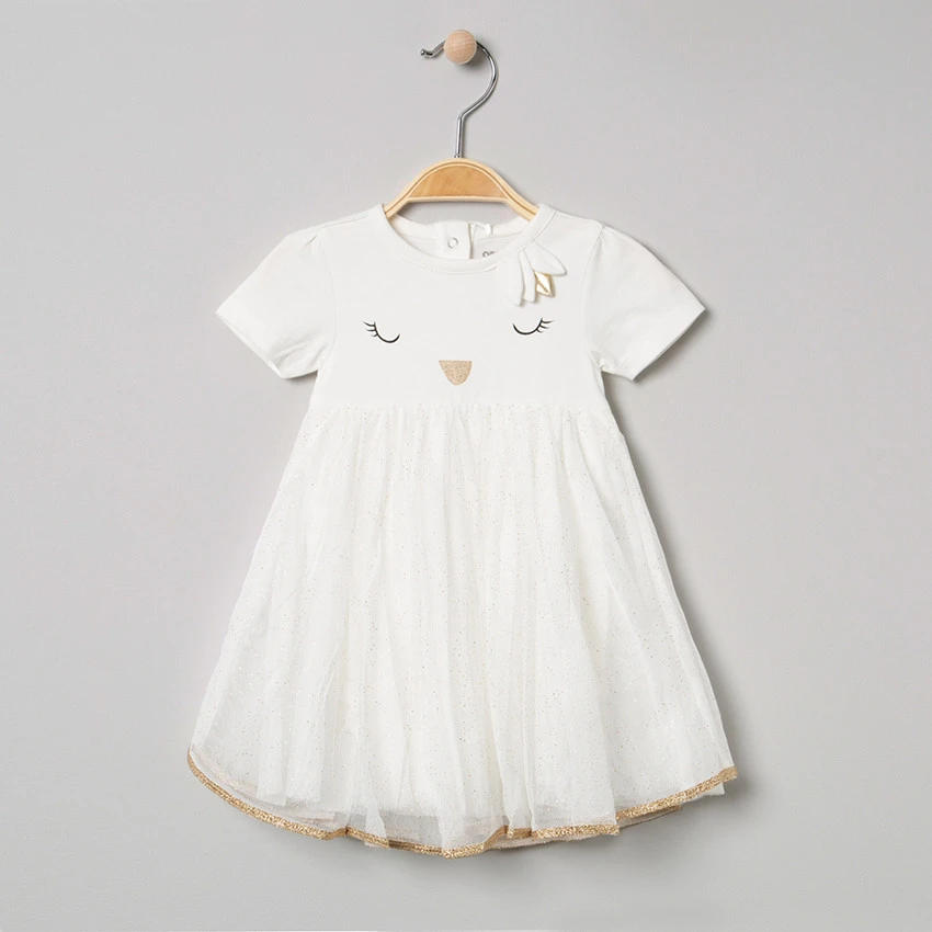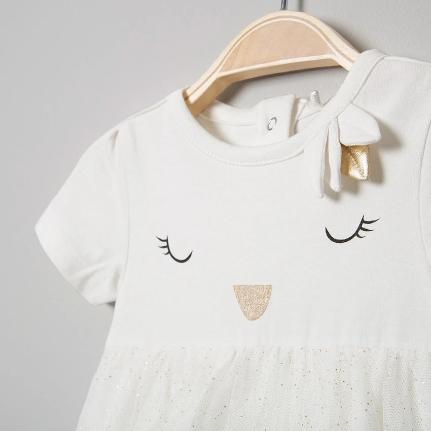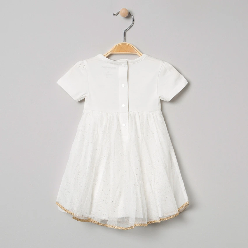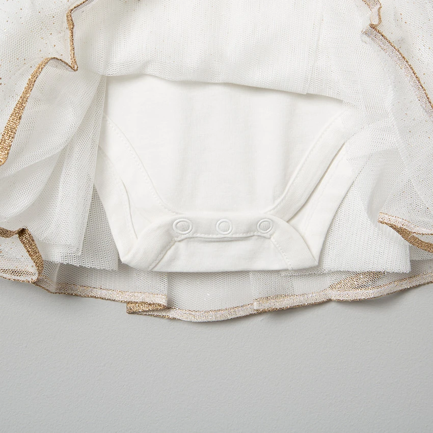 Body manches courtes forme robe. Encolure ronde en bord-côte avec empiècements. Détails printés. Bas de la robe en tulle finition dorée. Entrejambe pressionné.