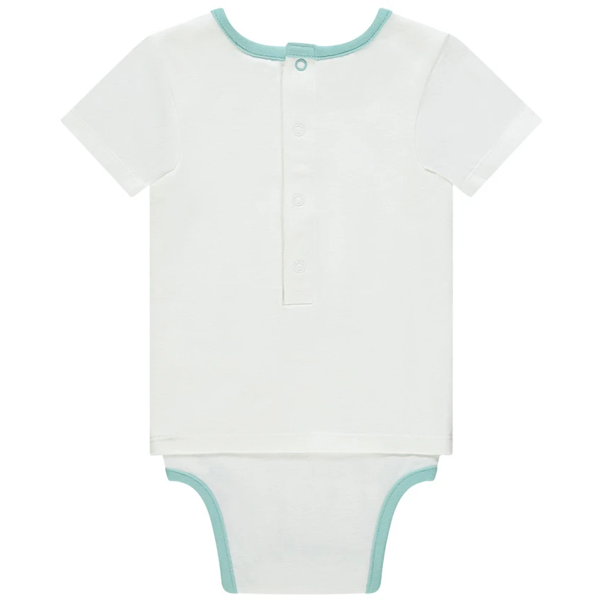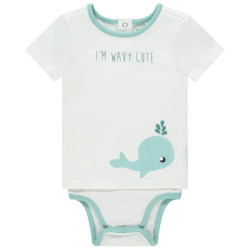Body manches courtes effet 2 en 1. Encolure ronde.Texte et baleine printĂ©s devant. Ouverture pressionnĂ©e au dos et Ă l’entrejambe. Biais bleu.