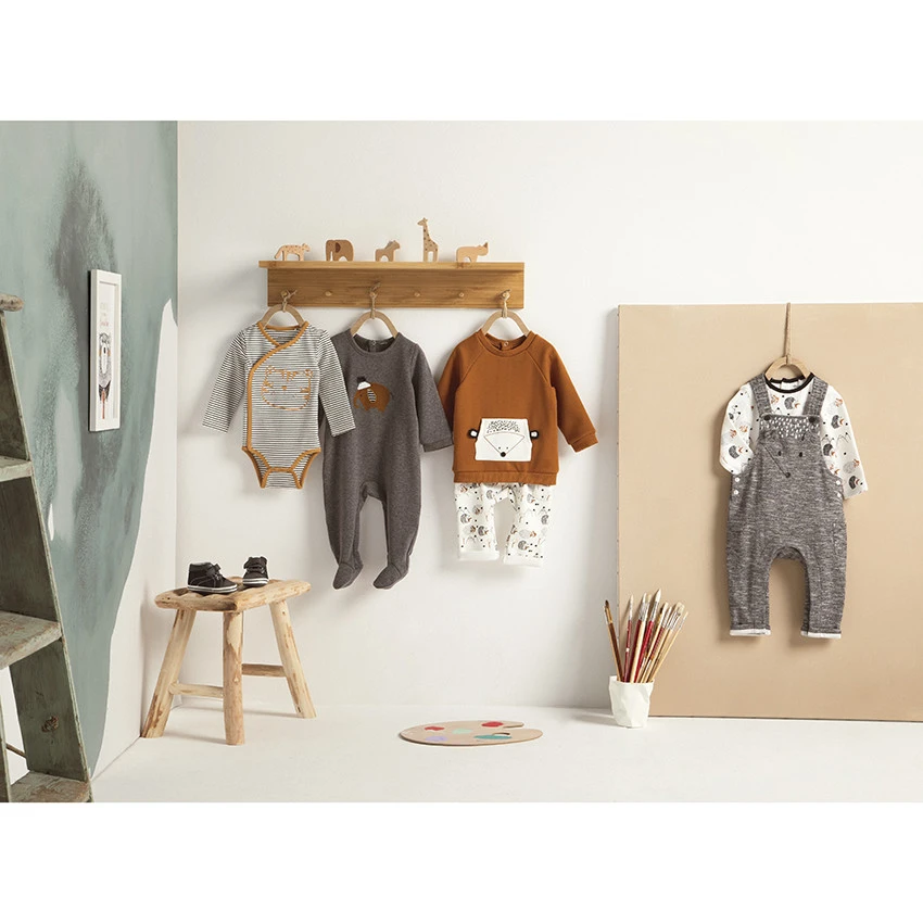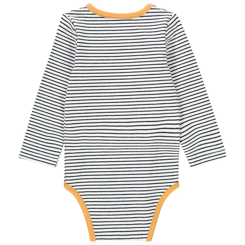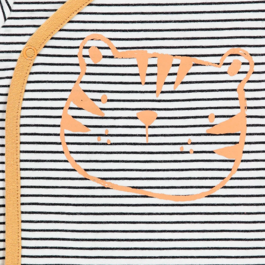 Body manches longues à rayures. Tigre printé sur le devant. Ouverture pressionnée devant et à l’entrejambe. Biais contrasté.