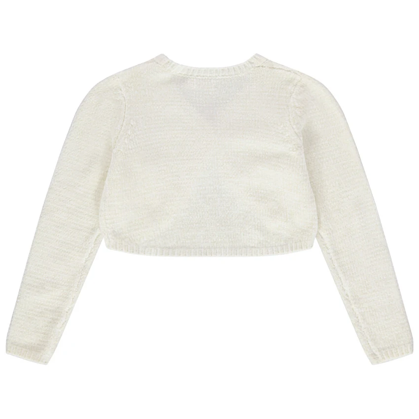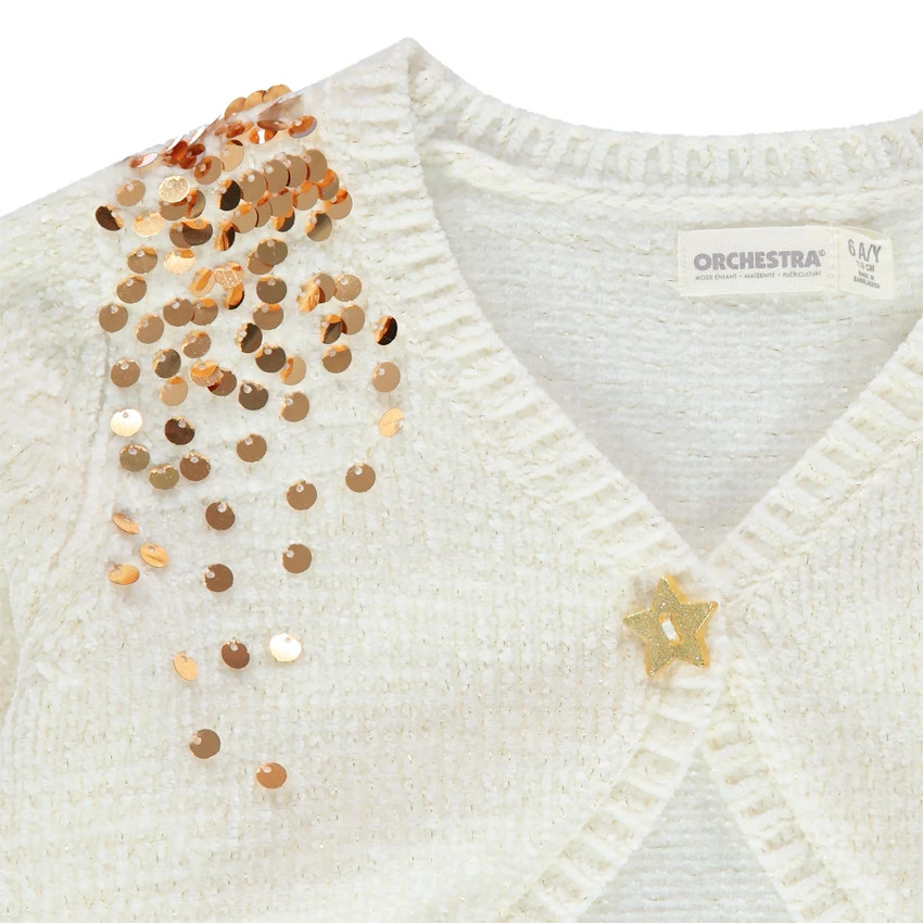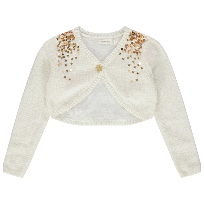Boléro en maille chenille. Sequins sur les épaules. Ouverture avec bouton forme étoile. Finitions en bord-côte.