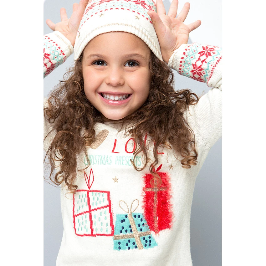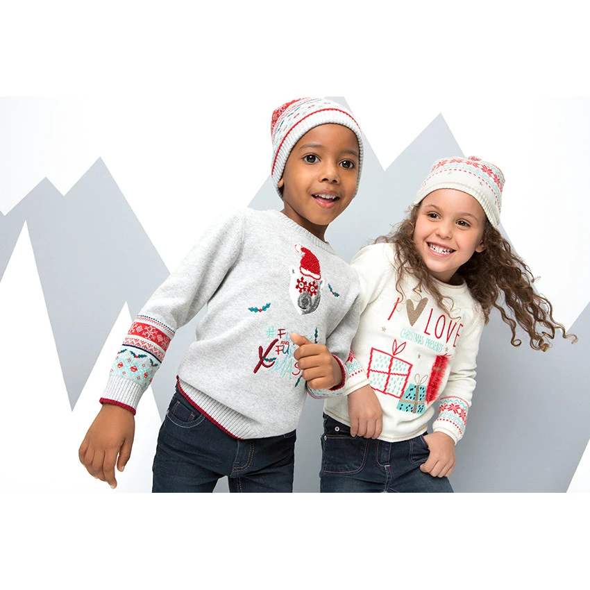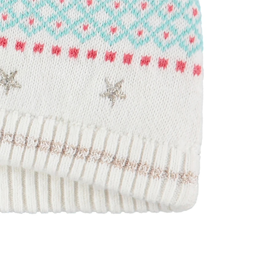Bonnet en tricot avec motif jacquard. Etoiles brodées en fil argenté. Finition en bord-côte. Pompon cousu sur le dessus.