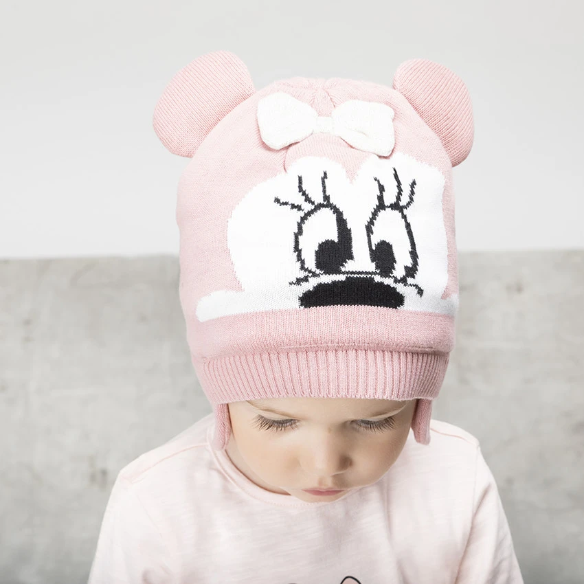 Bonnet en tricot. Motif Minnie en jacquard. Noeud cousu sur le devant. Oreilles en relief sur le dessus. Doublure en sherpa. Cache-oreilles pour bien protéger les plus petites du froid.