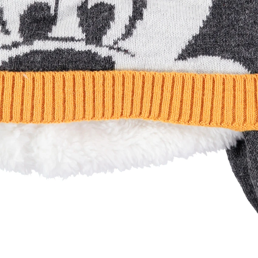 Bonnet Minnie en tricot. Doublure en sherpa. Oreilles en relief dessus. Noeud brodé. Protections pour les oreilles. Finition bord-côte jaune.