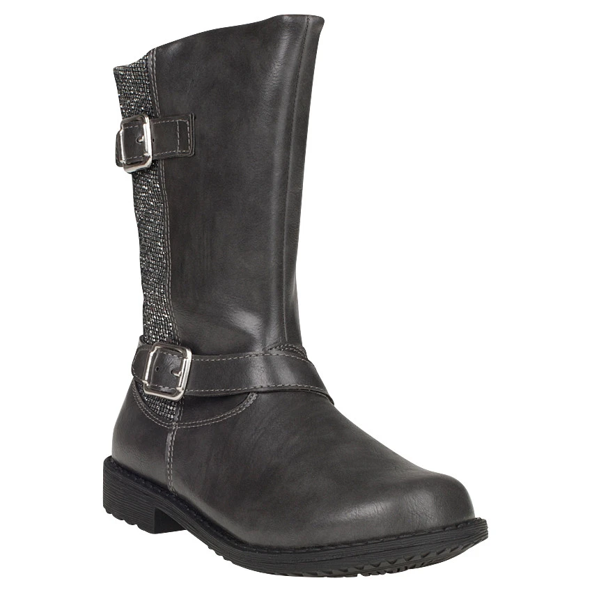 Bottes coloris anthracite. Ouverture par zip sur le côté. 2 brides fantaisie avec boucle sur le côté. Empiècement avec strass fantaisie, cousu à l’arrière de la botte. Jeu de surpiqûres. Semelle extérieure crantée en caoutchouc.