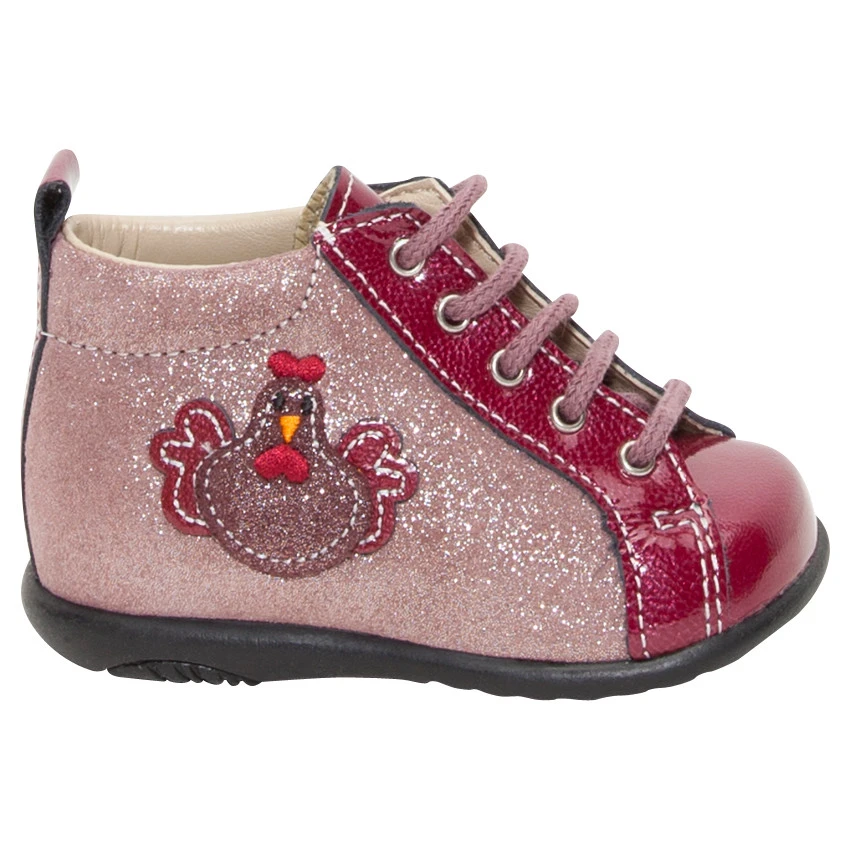 Bottillons en cuir rose pailleté. Jeu d’empiècements vernis, coloris bordeaux. Fermeture à lacets pour une parfaite adaptation à la forme du pied. Patch poule fantaisie cousu sur le côté. Bourrelet de renfort à la cheville pour protéger le talon. Contrefort à l’arrière de la cheville pour éviter toute déviation du pied. Jeu de découpes avec surpiqûres. Semelle contrastée antidérapante en caoutchouc.