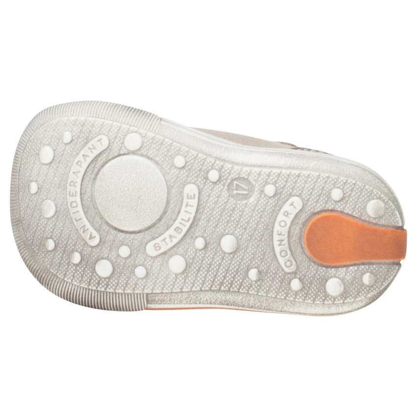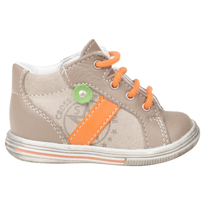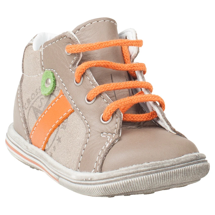 Bottiloons en cuir bi-matière. Ouverture devant par lacets contrastés. Empiècements contrastés et print sur le côté droit. Doublure intérieure en cuir. Contrefort à l’arrière de la chaussure pour un bon maintien du pied. Semelle souple en caoutchouc pour favoriser la marche.