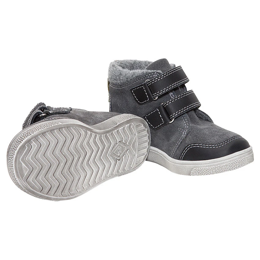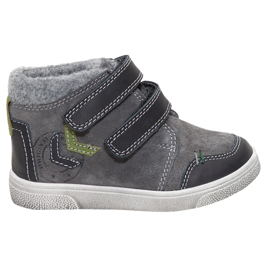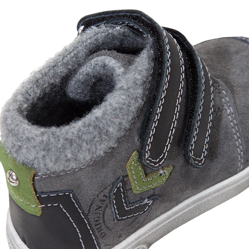 Bottillons en cuir suédé. Ouverture devant par 2 scratchs. Empiècements au dos et sur les côtés. Col et doublure en fausse fourrure. Semelle effet used.