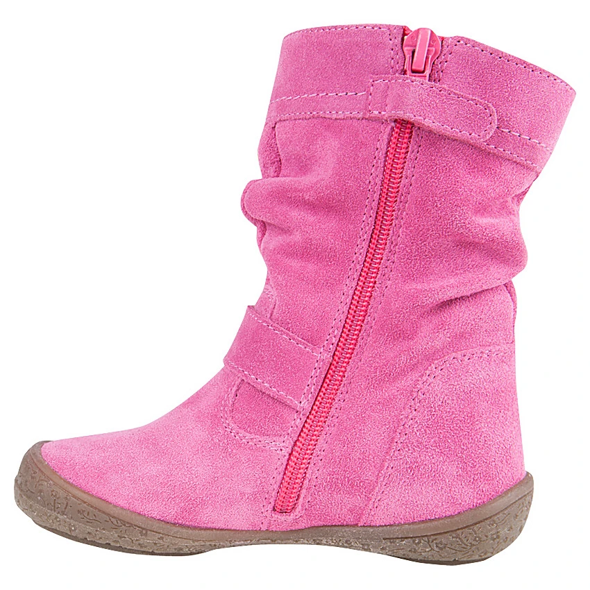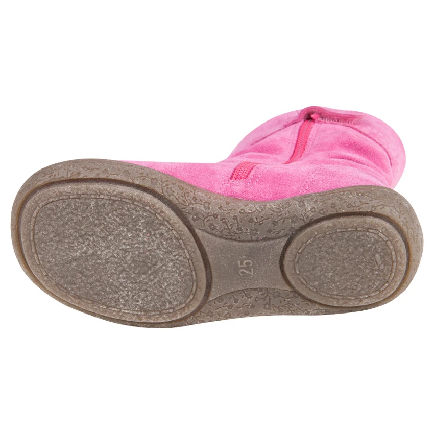 Bottines en cuir suédé souple. Coloris rose uni. Jeux de découpes marquées sur le haut et le devant de la chaussure. Patte fantaisie sur le haut de la botte avec oeillet métallique et lien fantaisie. Bride sur le dessus du pied avec fleur fantaisie sur le côté. Fermeture sur un côté par zip. Patte pressionnée de sécurité. Surpiqûres. Semelle extérieure en caoutchouc avec motifs fantaisie fleurs.