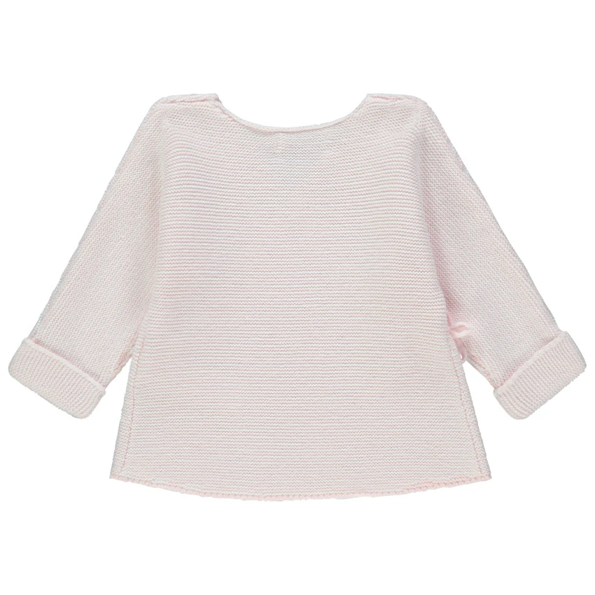 Brassière de naissance en tricot uni. Coton issu de l’agriculture biologique. Ouverture croisée avec liens à nouer devant. Dos uni.