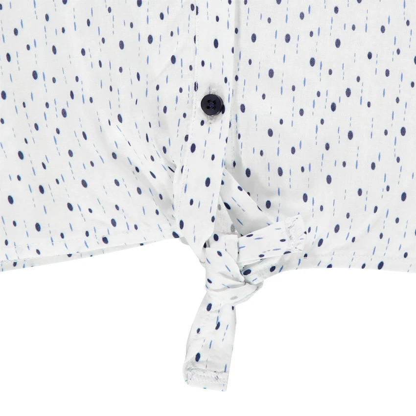 Chemise manches courtes volantées. Col à biais contrasté. Ouverture boutonnée devant. Liens à nouer sur le devant.