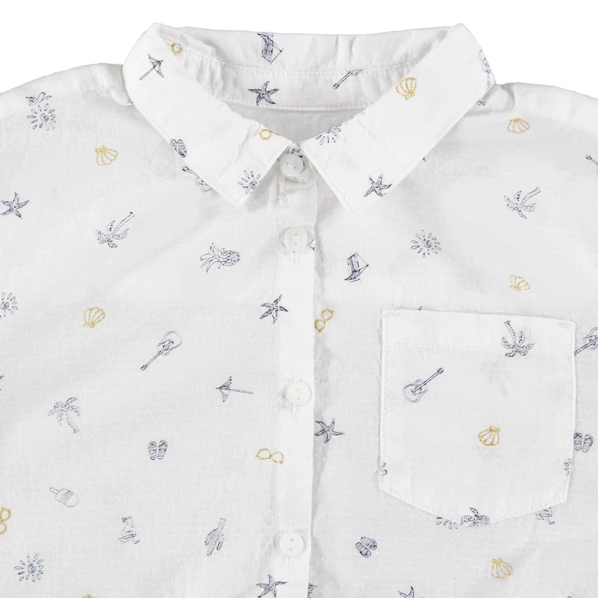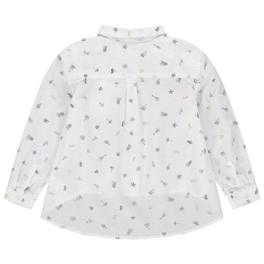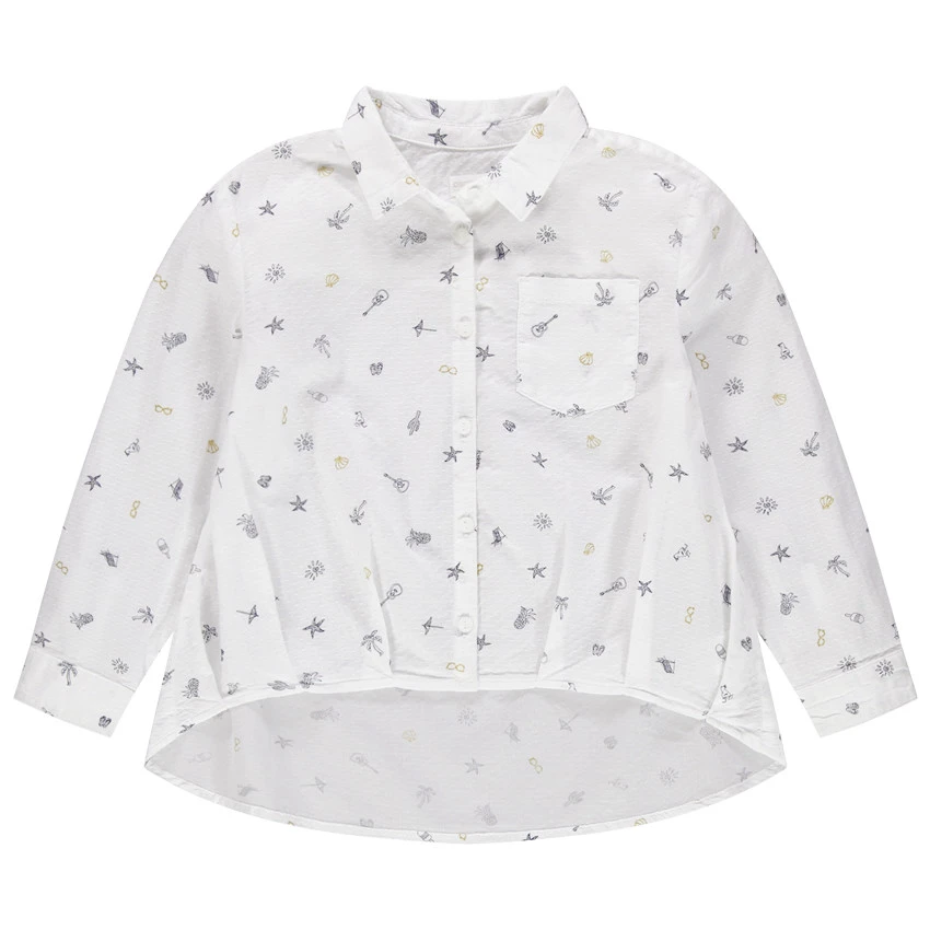 Chemise manches longues asymétrique. Maille fantaisie. Imprimé fantaisie all-over. 1 poche plaquée sur la poitrine. Plus court devant. Poignets patte capucin 1 bouton.