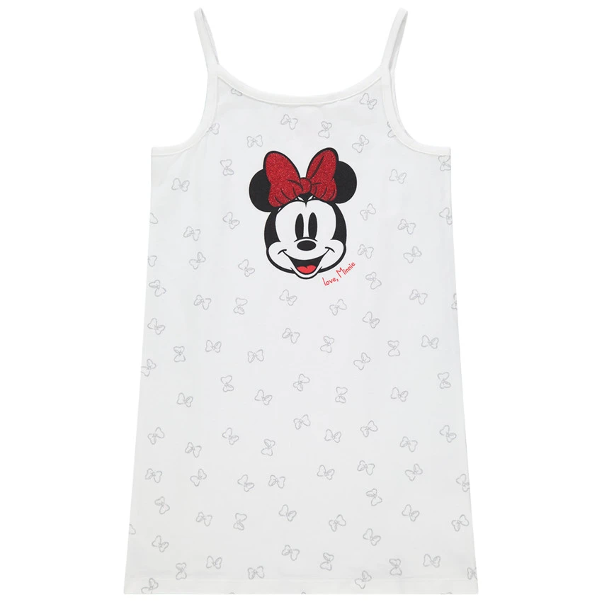 Chemise de nuit en coton issu de l’agriculture biologique. Bretelles fines. Noeuds printés all-over. Minnie printée avec noeud pailleté sur le devant.