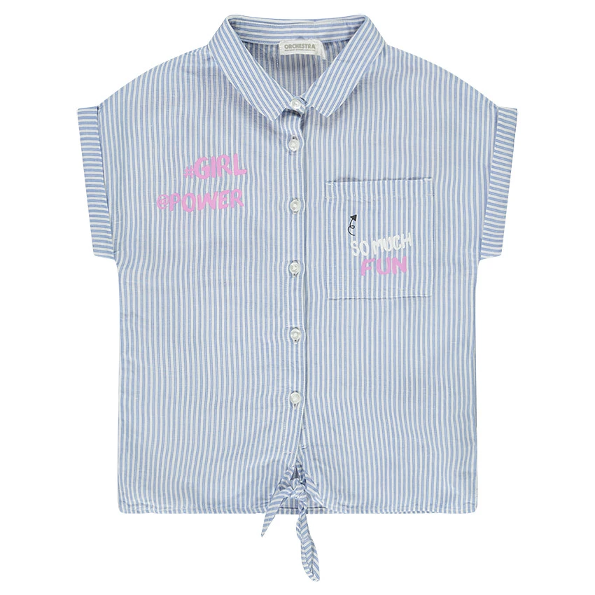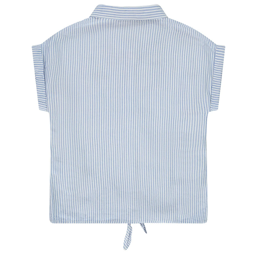 Chemise manches courtes à revers. Col chemise. Ouverture boutonnée sur le devant. Une poche plaquée sur la poitrine. Inscriptions printées. Noeud fantaisie à nouer sur le bas de la chemise.