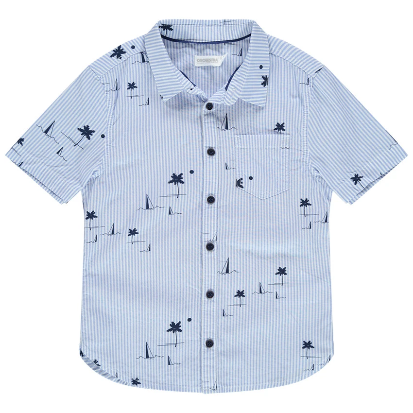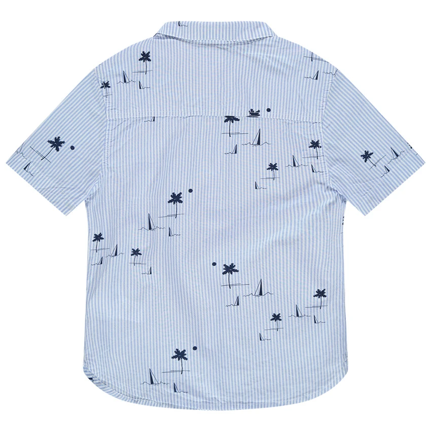 Chemise manches courtes à rayures verticales. Palmiers et bateaux imprimés all-over. 1 Poche plaquée sur la poitrine. Revers au bout des manches.
