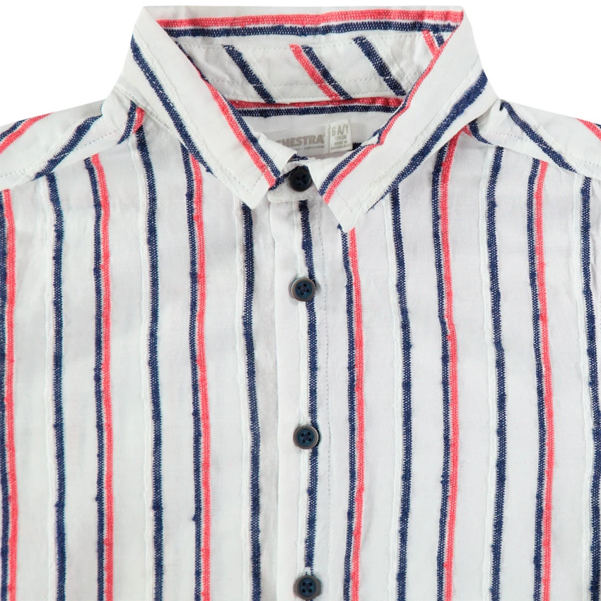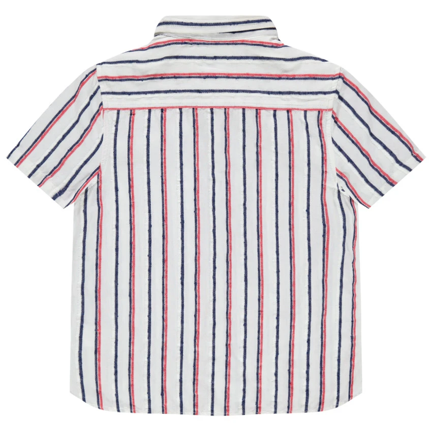 Chemise manches courtes à rayures contrastées verticales. Col chemise. Ouverture boutonnée devant.