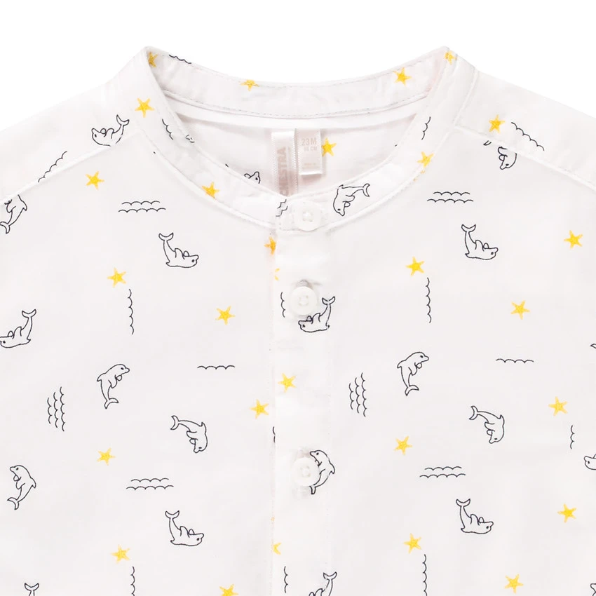 Chemise manches courtes. Col mao. Ouverture boutonnée sur le devant. Imprimé dauphins/étoiles all-over.