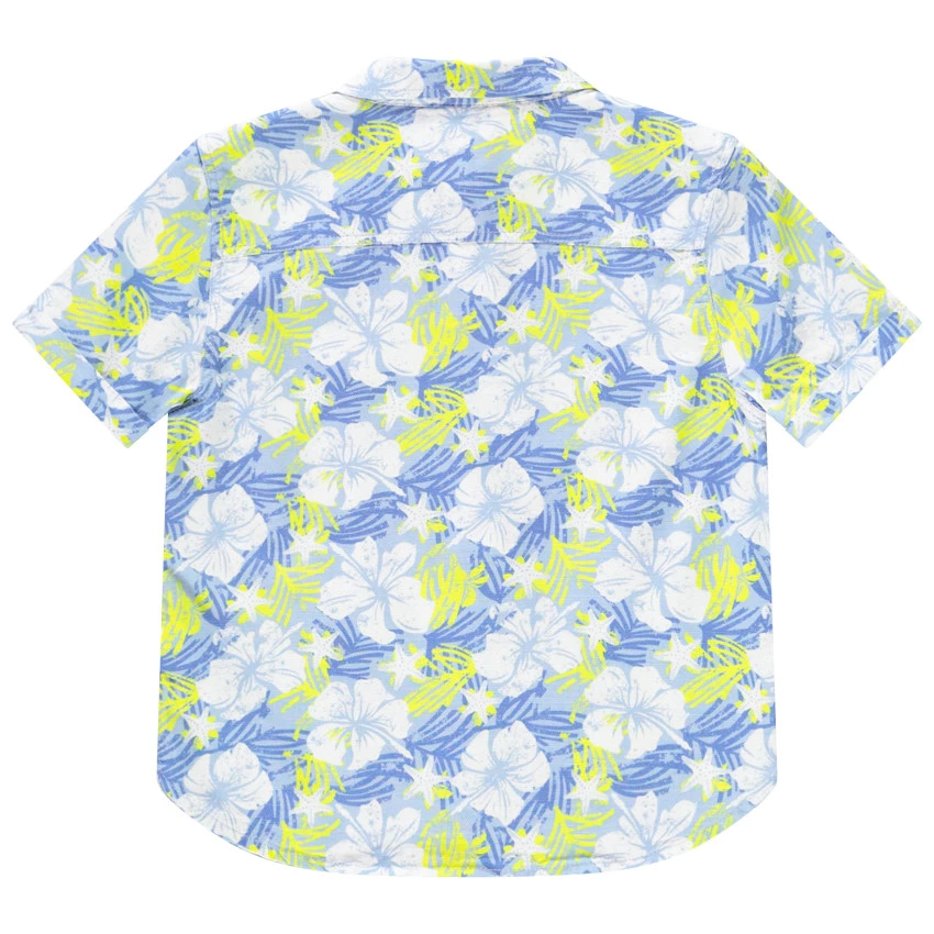 Chemise manches courtes. Col chemise. Ouverture boutonnée sur le devant. Une poche plaquée sur la poitrine. Imprimé fleurs/étoiles all-over.