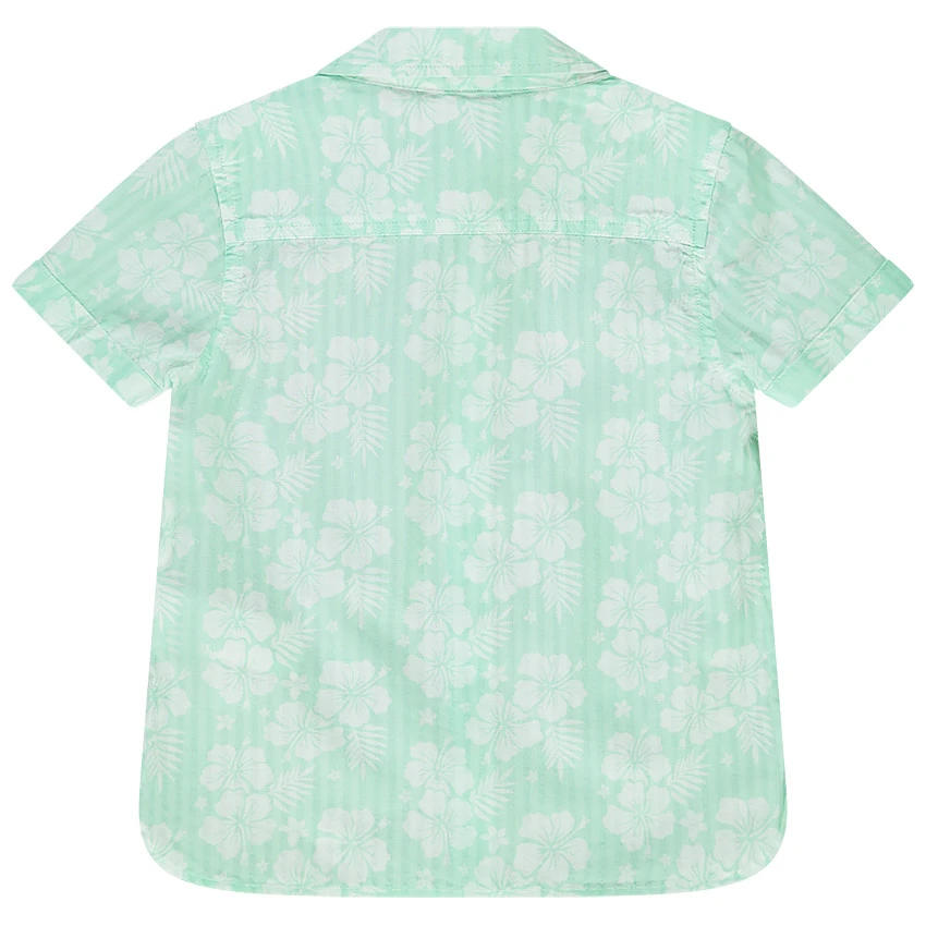 Chemise manches courtes. Col chemise. Ouverture boutonnée sur le devant. Imprimé hibiscus all-over. Rayures ton sur ton.