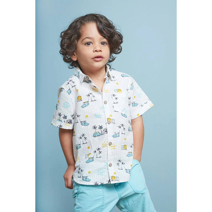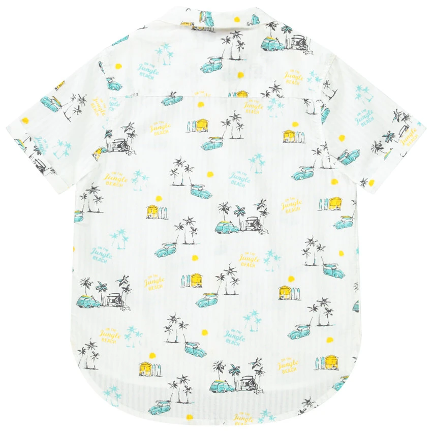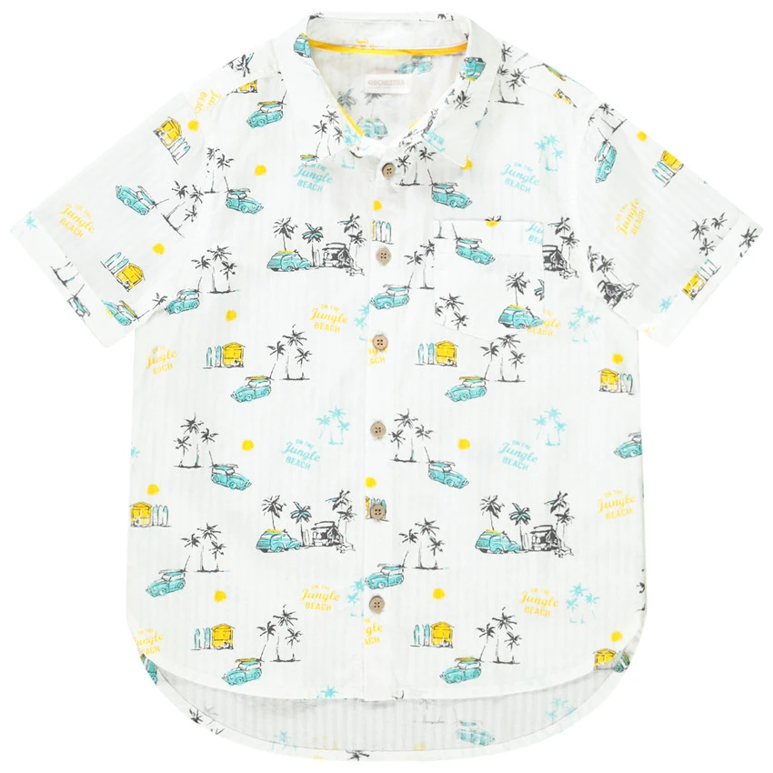 Chemise manches courtes à revers. Col chemise. Ouverture boutonnée sur le devant. Une poche plaquée au niveau de la poitrine. Imprimé jungle beach all-over.