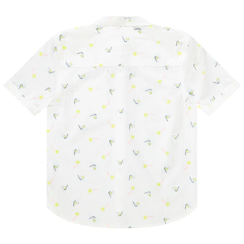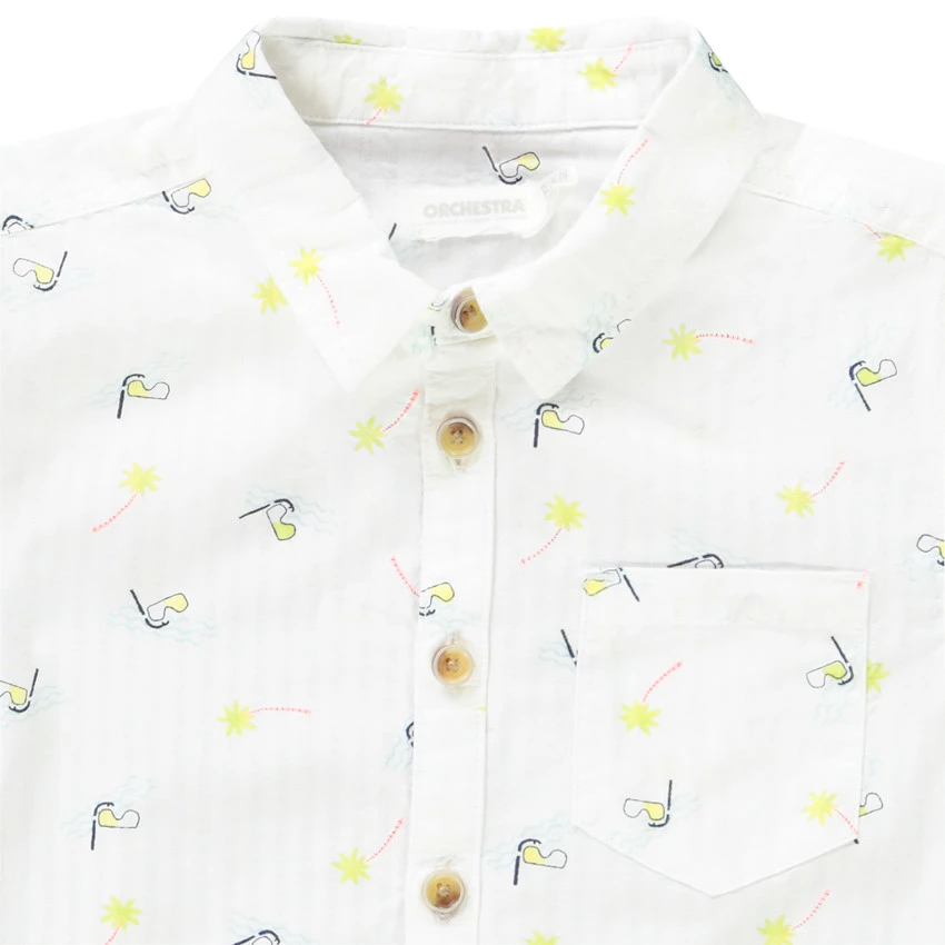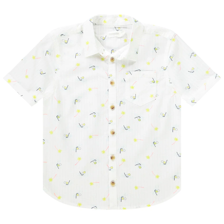 Chemise manches courtes. Col chemise. Ouverture boutonnée sur le devant. Une poche plaquée sur la poitrine. Rayures verticales ton sur ton. Imprimé masques/palmiers all-over.