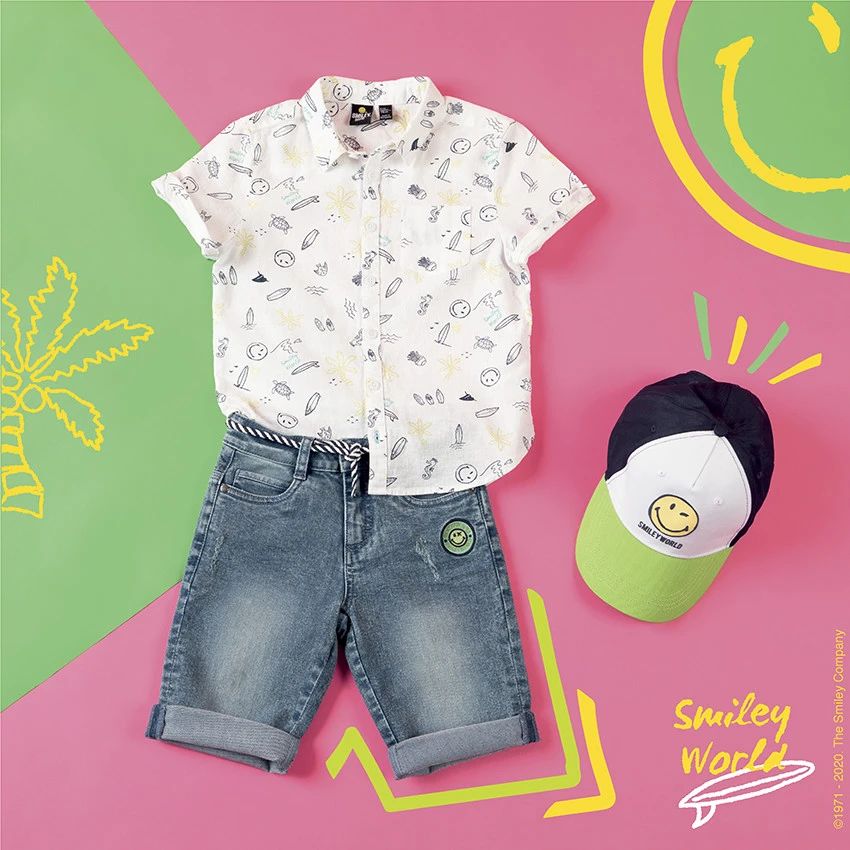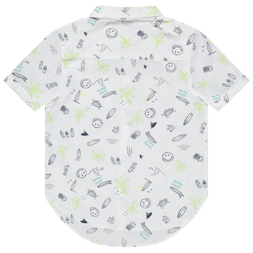 Chemise manches courtes en coton et lin imprimée SmileyWorld pour enfant garçon. Col chemise. Ouverture boutonnée devant. 1 poche plaquée sur la poitrine. Plus longue au dos.
