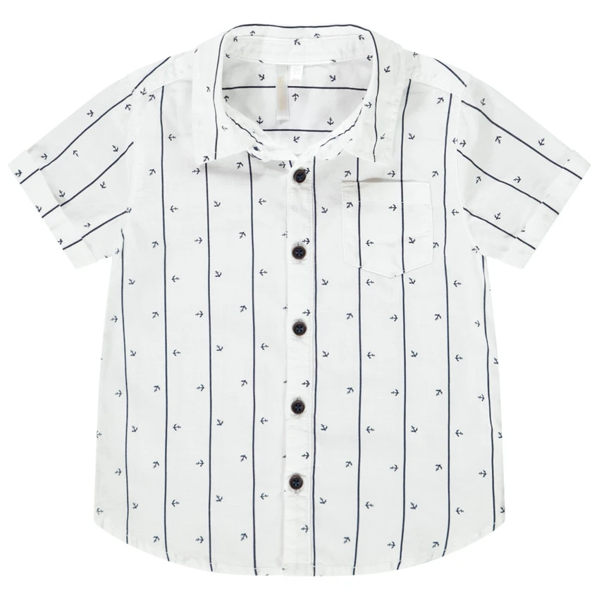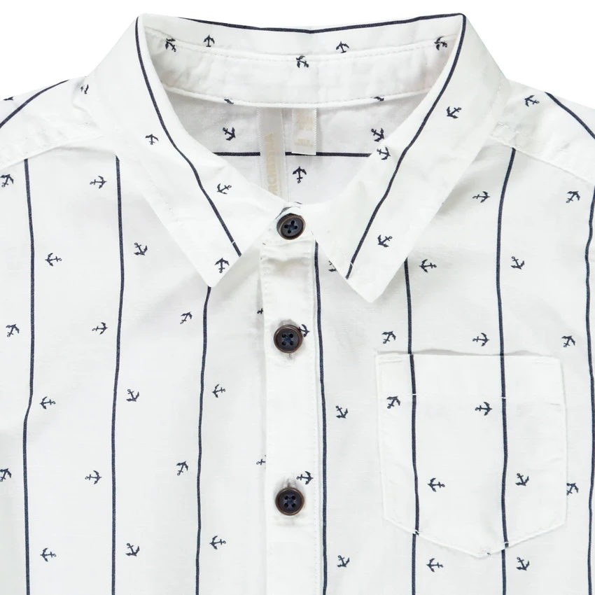 Chemise manches courtes à revers. Col chemise. Ouverture boutonnée sur le devant. Une poche plaquée sur la poitrine. Rayures verticales et imprimé ancres all-over.