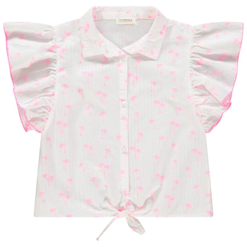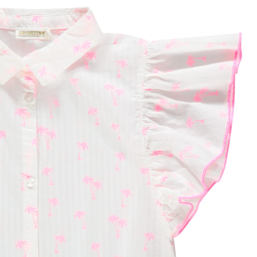 Chemise à manches volantées. Palmiers printés all-over. Col chemise. Ouverture boutonnée devant. Liens à nouer sur le devant.