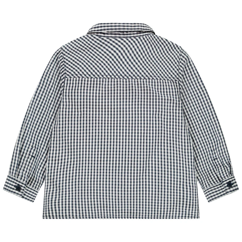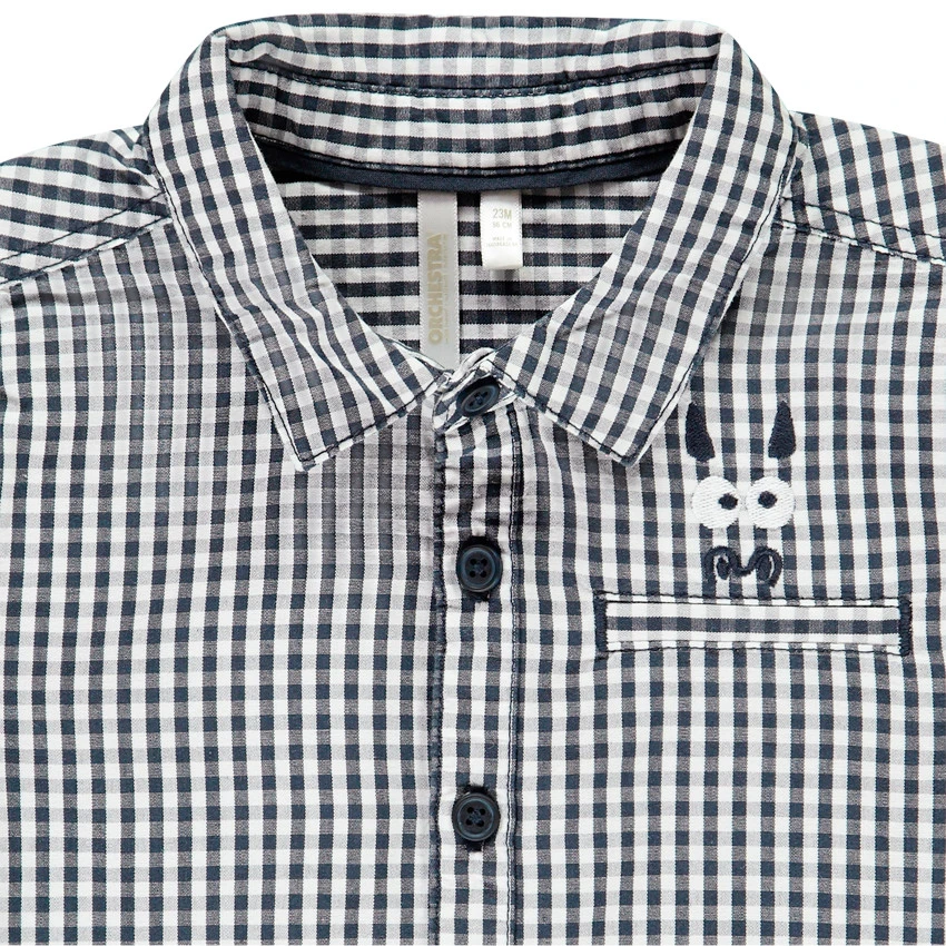 Chemise manches longues à carreaux vichy. Col chemise. Ouverture boutonnée devant. 1 poche passepoilée sur la poitrine avec monstre en relief. Poignets boutonnés.