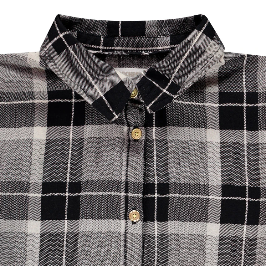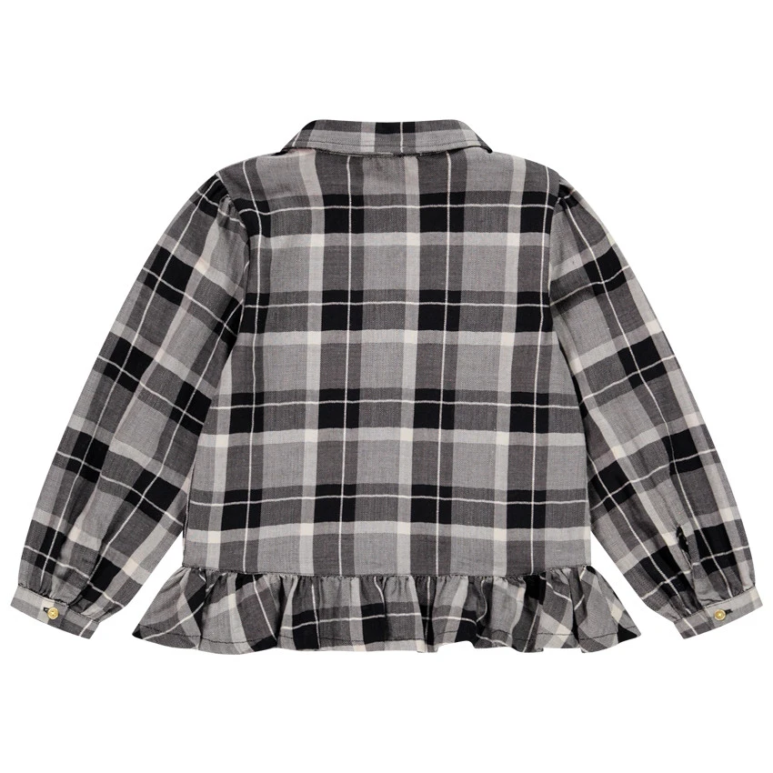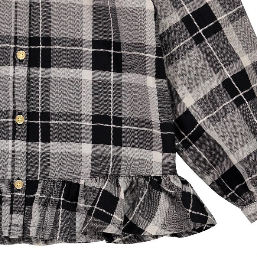 Chemise manches longues à carreaux. Maille très finement brillante. Col chemise. Ouverture boutonnée devant. Bas de la chemise volanté. Poignets boutonnés.