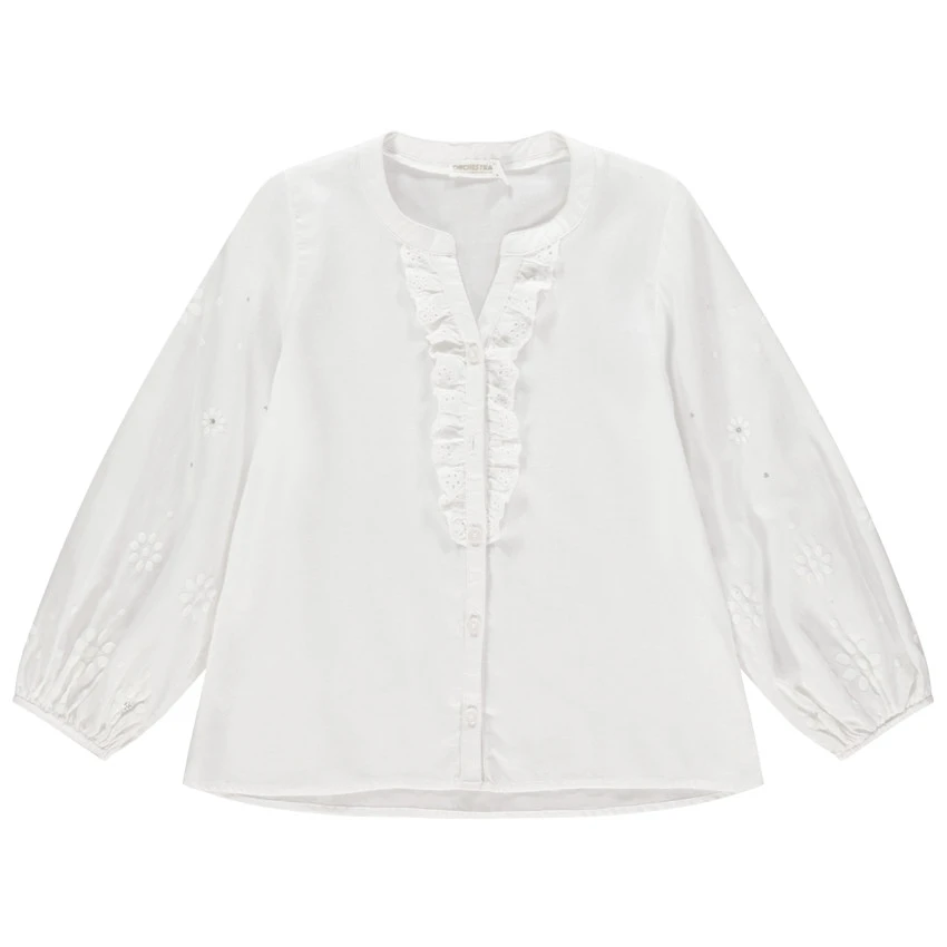 Chemise manches longues en coton. Col tunisien à jabots en broderie anglaise. Ouverture boutonnée devant. Broderies florales sur les manches. Bout des manches resserrés.