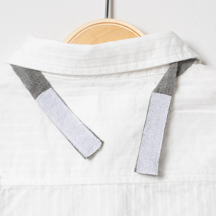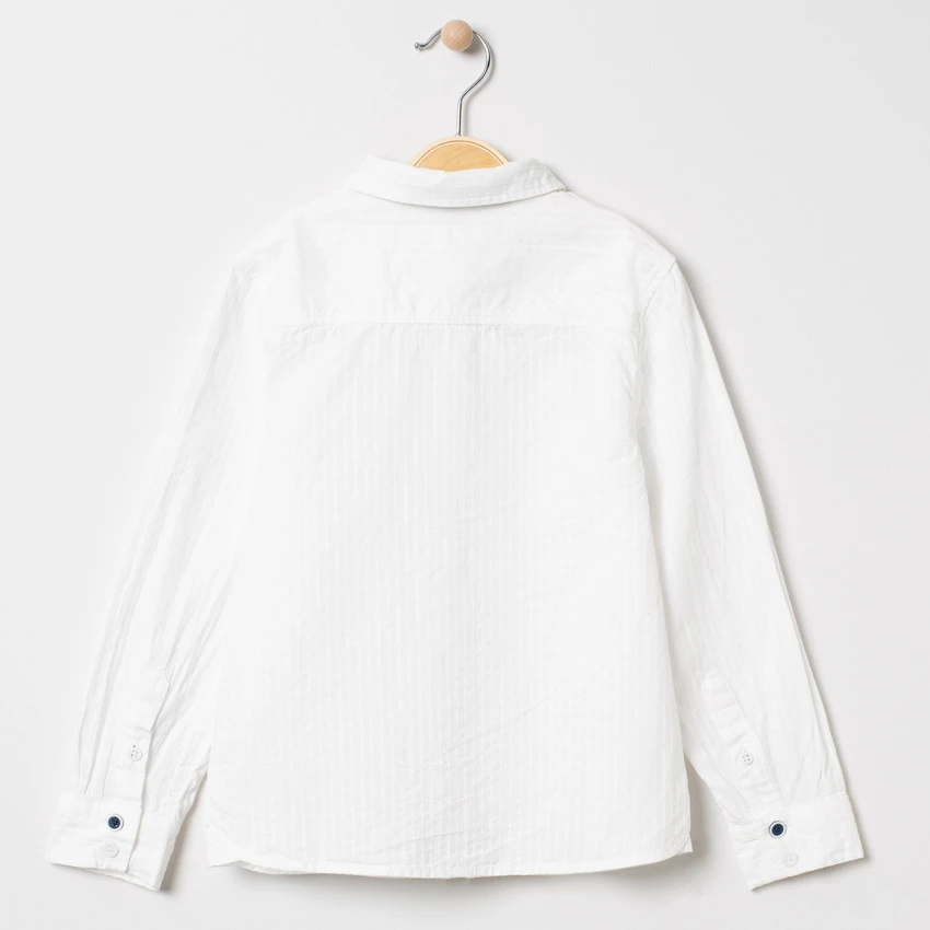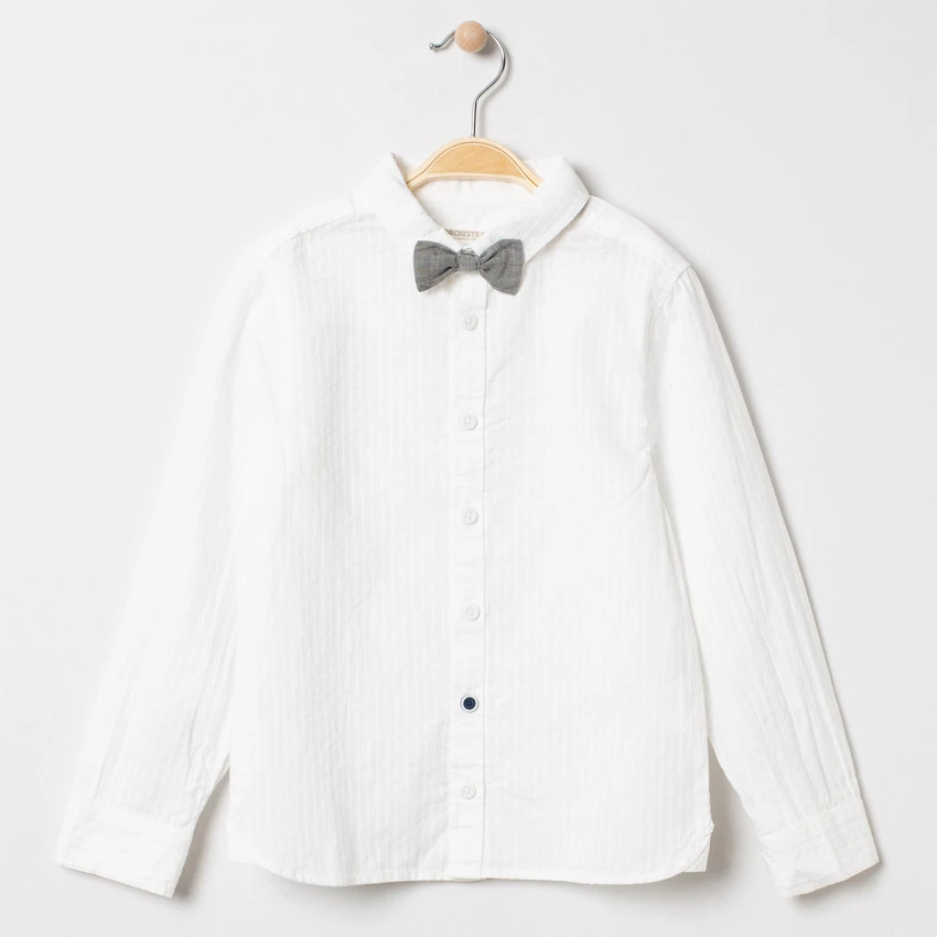 Chemise manches longues à rayures verticales ton sur ton. Col chemise. Ouverture boutonnée sur le devant. Noeud en chambray. Noeud en maille à chevrons à scratch. Poignets patte capucin à boutons.