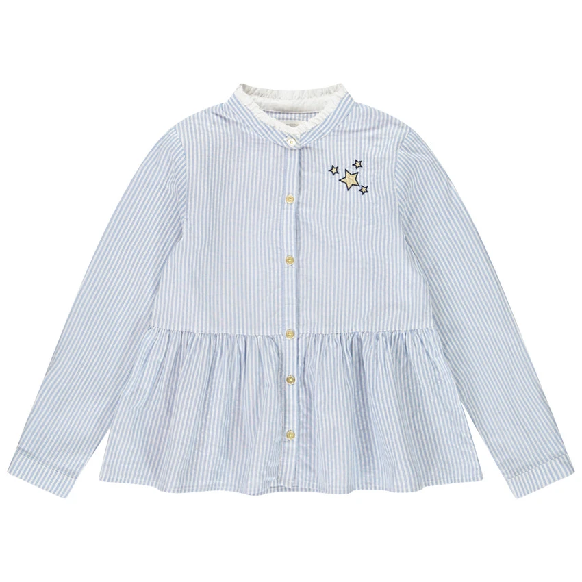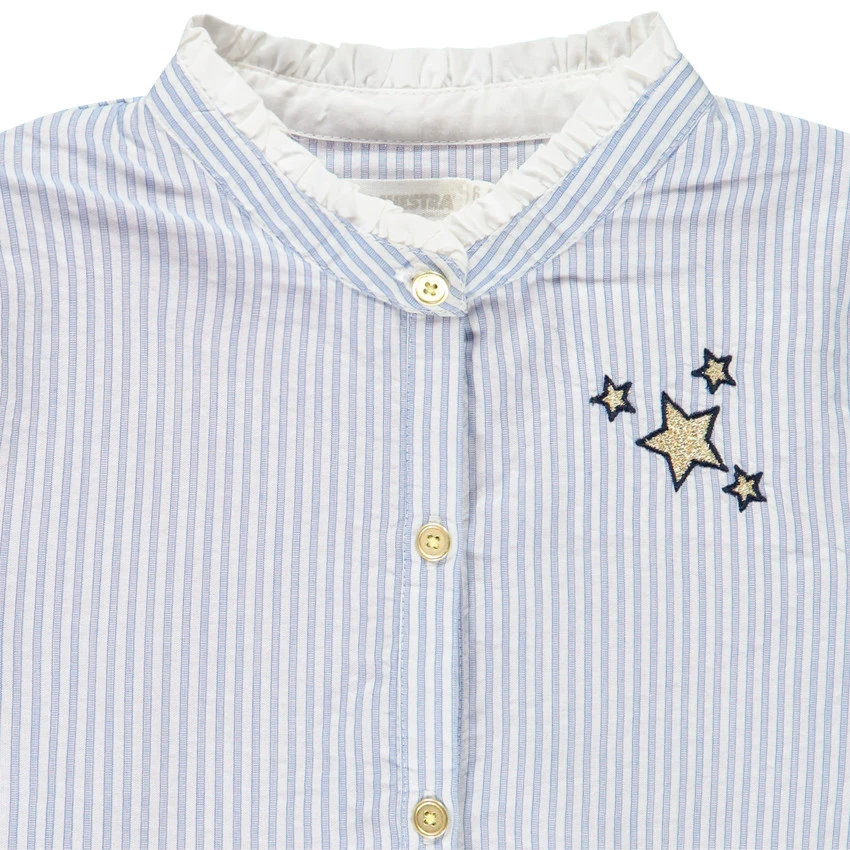 Chemise manches longues pour fille. Rayures sur l’intégralité de la chemise. Col fantaisie volanté. Ouverture boutonnée sur le devant. Etoiles dorées brodées sur la poitrine. Bas de la chemise volanté.