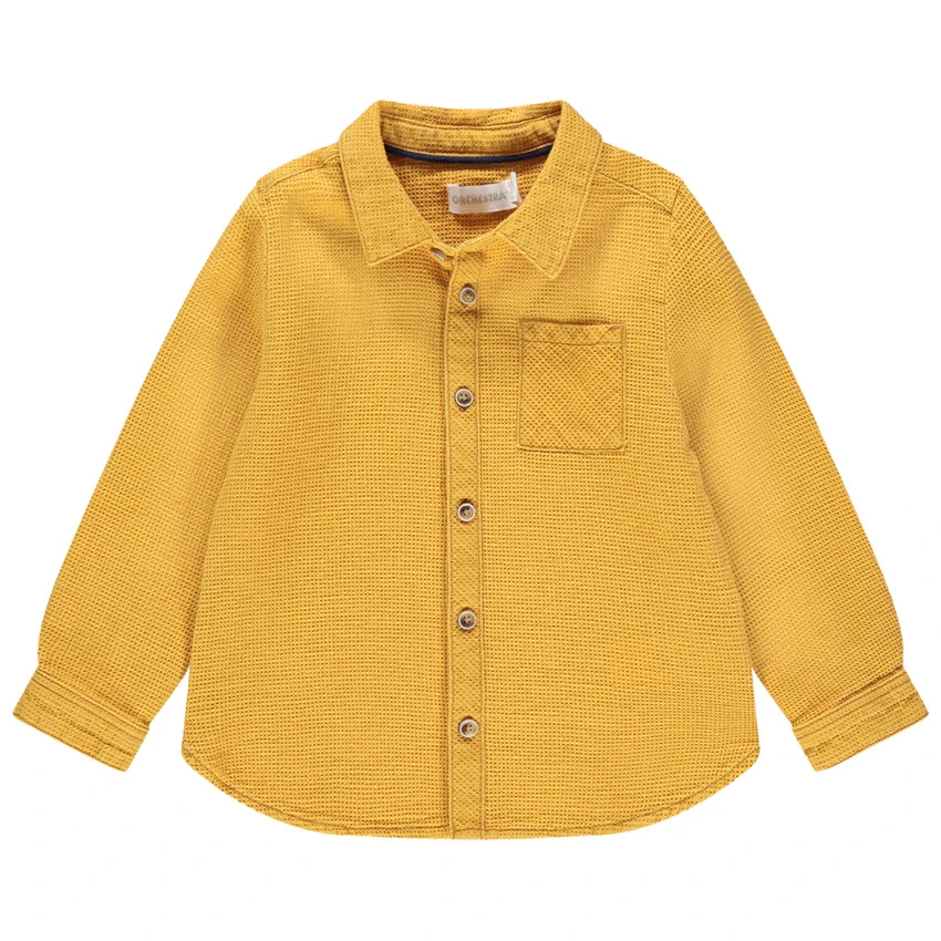 Chemise manches longues en maille fantaisie. Col chemise. 1 poche plaquée sur la poitrine. Poignets patte capucin. Ouverture boutonnée devant.