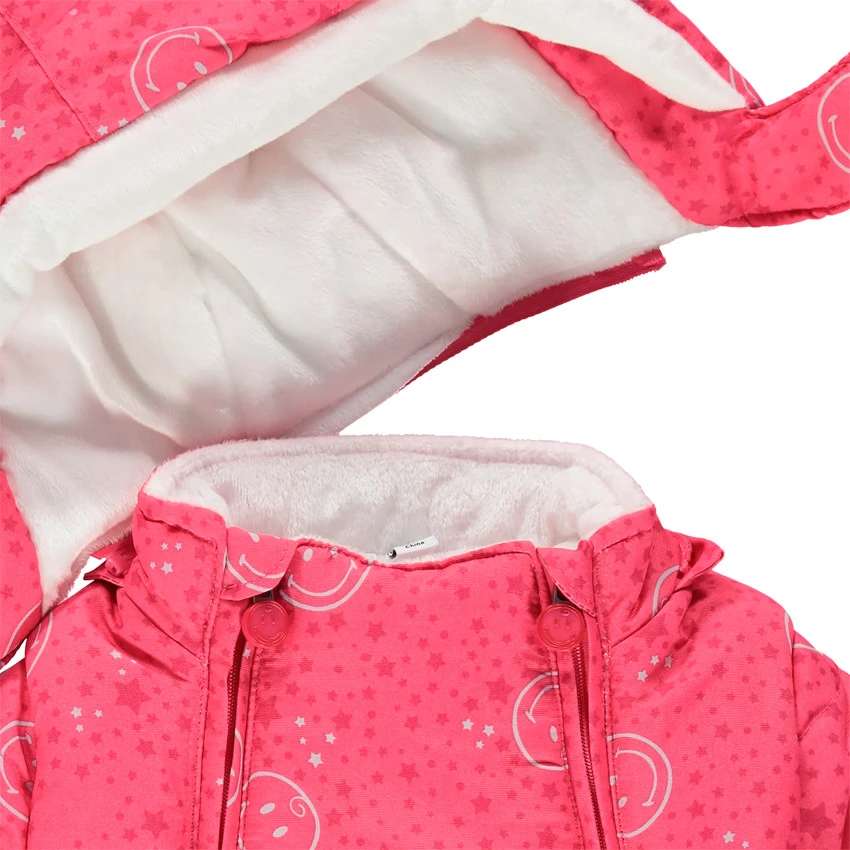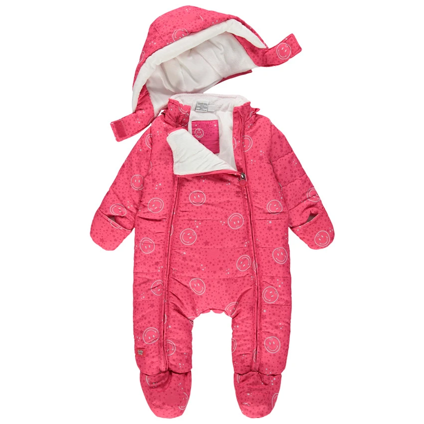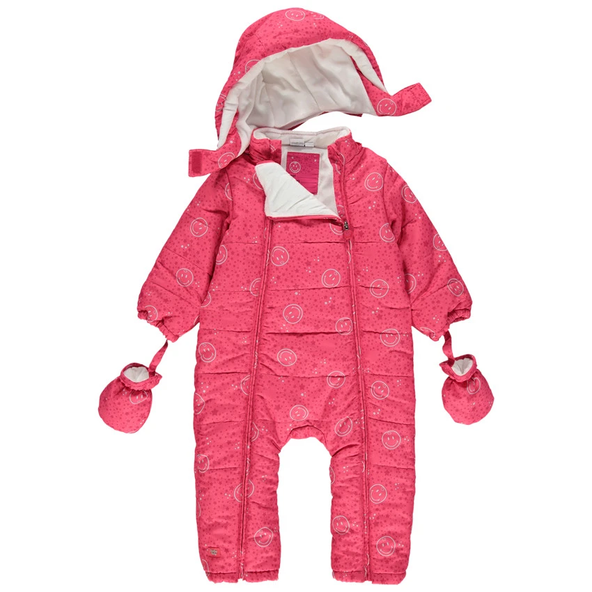 Combinaison pilote de ski imperméable. Effet matelassé. Coloris fushia. Imprimé Smiley Baby et étoiles « all-over ». Doublure intérieure ouatinée en micropolaire. Capuche amovible par zip et ouverture devant pat patte auto-agrippante. Col montant. Double ouverture zippée sur le devant avec protection anti-pincement.