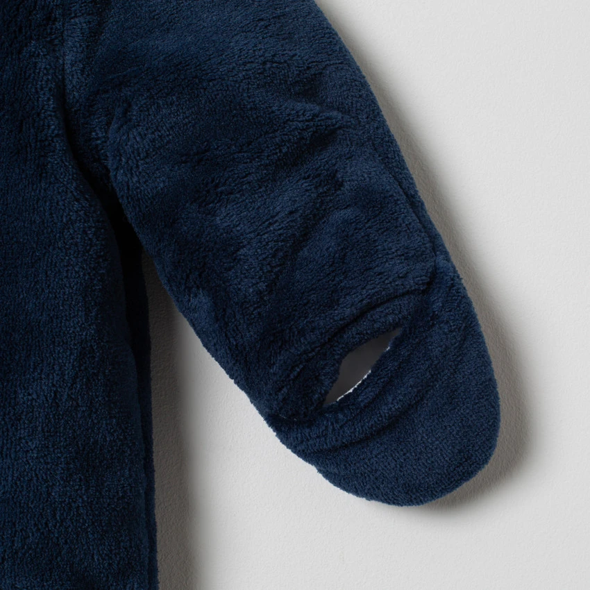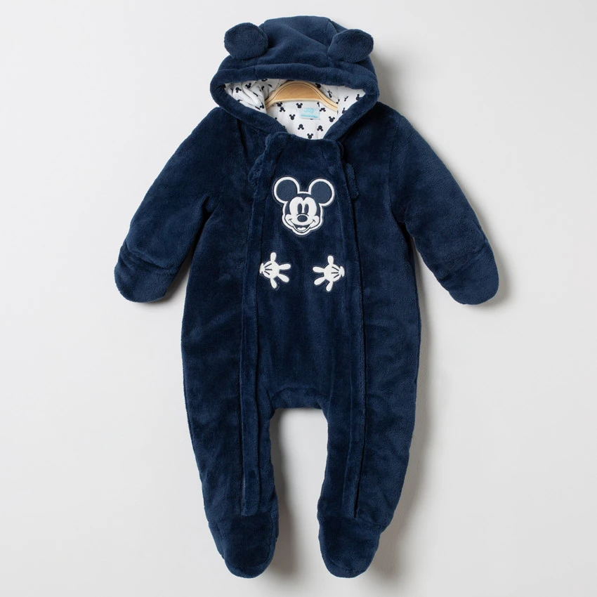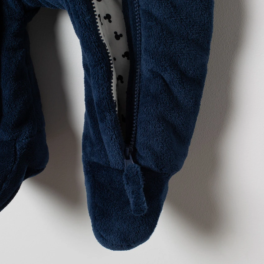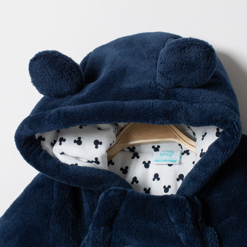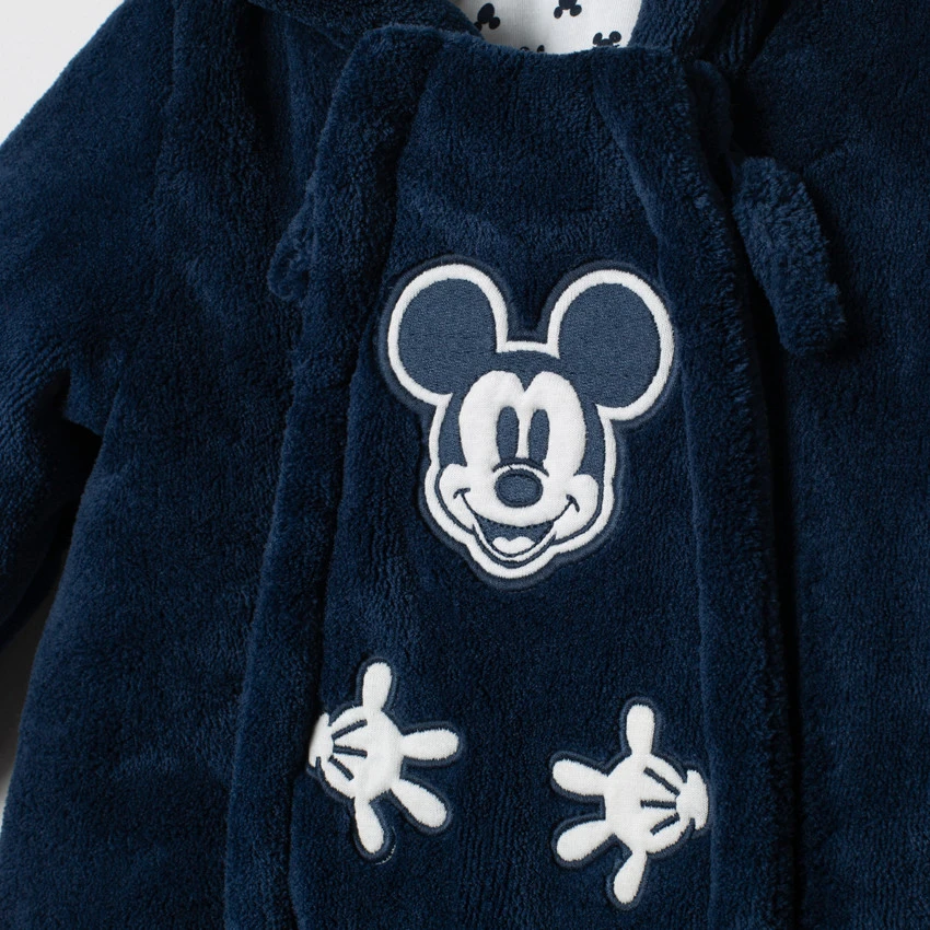 Comb-pilote à capuche en sherpa. Oreilles en relief sur le dessus. Doublure en jersey imprimée all-over. Double ouverture zippée devant. Mickey patché devant. Passage pour les mains.