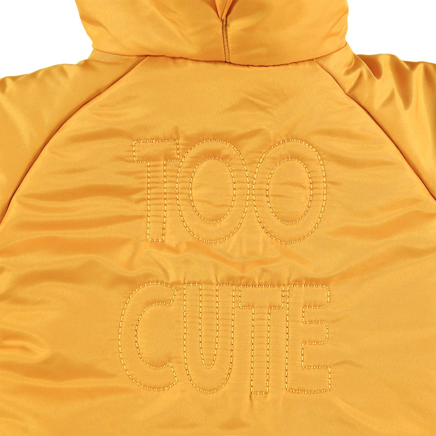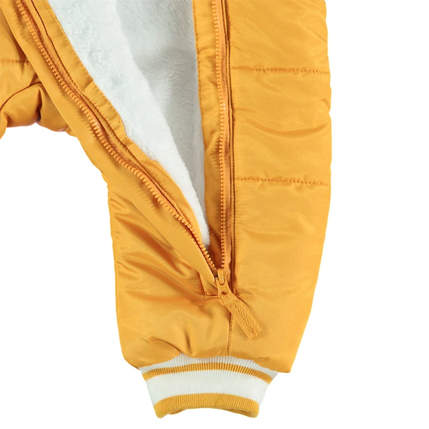 Combi-pilote matelassée unie. Capuche fantaisie avec crête en relief. Doublure intérieure ouatinée. Doublure intérieure en sherpa. Double ouverture zippée sur le devant. Poignets et chevilles en bord-côte rectiligne. Inscription en relief au dos.