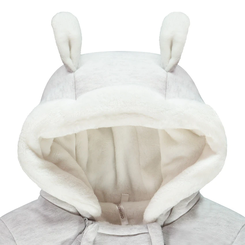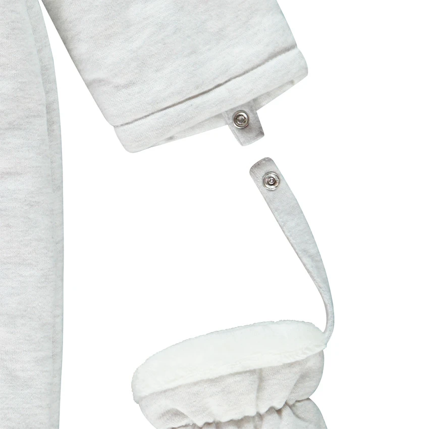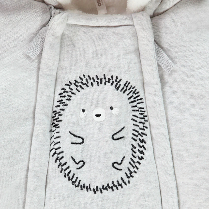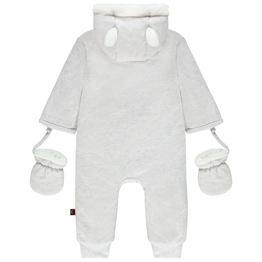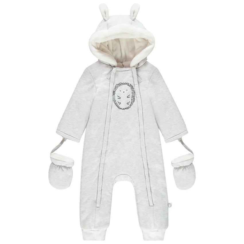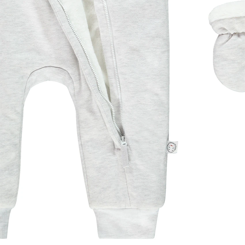 Combi-pilote pour bébé garçon. Capuche avec Bordure en sherpa et oreilles en relief. Doublure en sherpa. Double ouverture zippée devant. Motif hérisson brodé devant. Moufles amovibles par liens pressionnés. Bas des jambes en maille extensible.